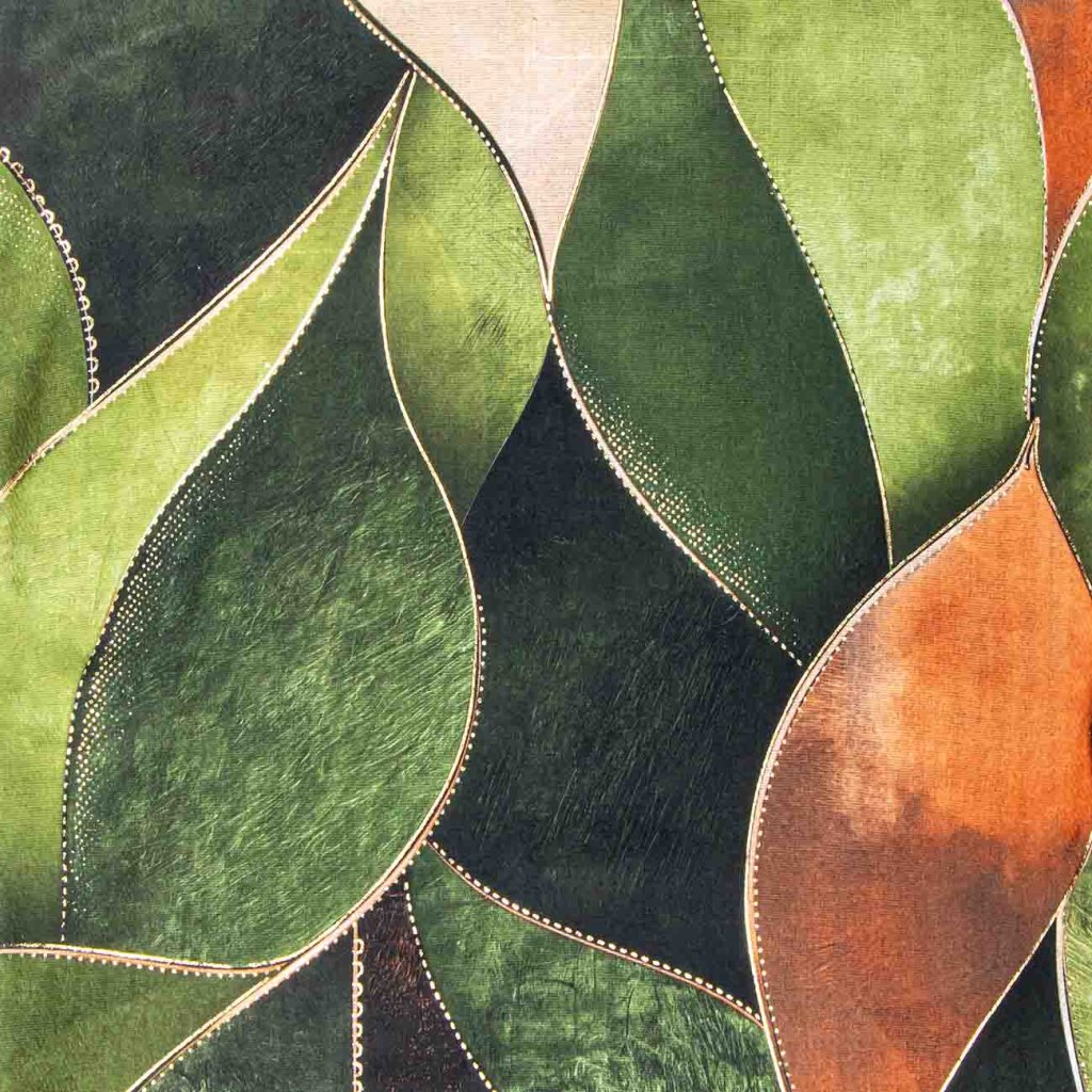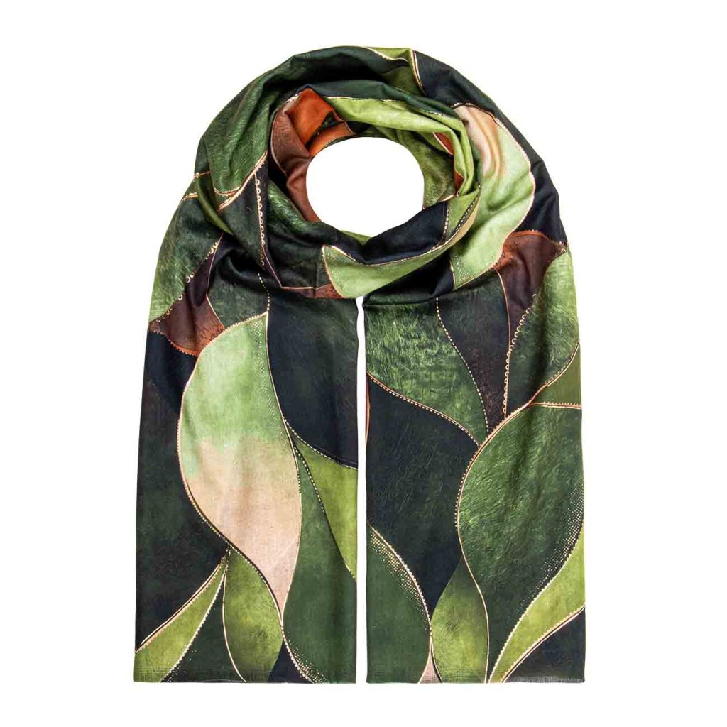 Șal stilat cu motiv abstract de frunze în combinații de verde, negru și maro. Imprimeul auriu evidențiază liniile individuale și îi conferă un aspect nobil.