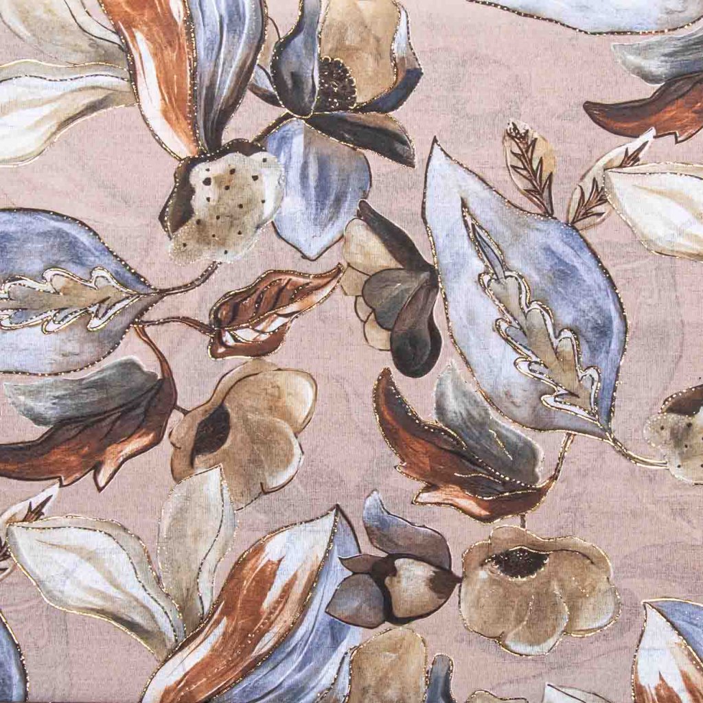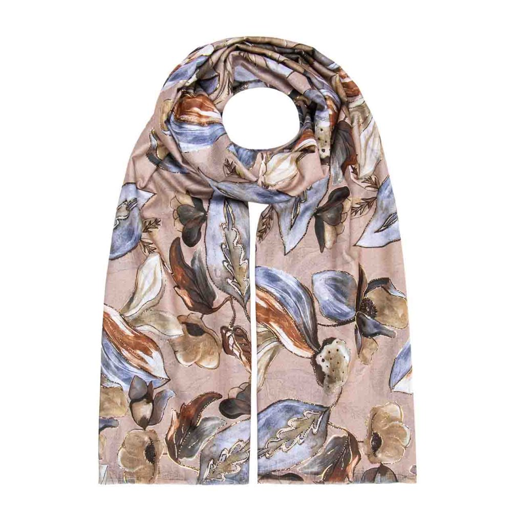 Șal bej cu un motiv floral delicat și imprimeu auriu în tonuri calde. Un accesoriu universal, potrivit pentru orice ținută.