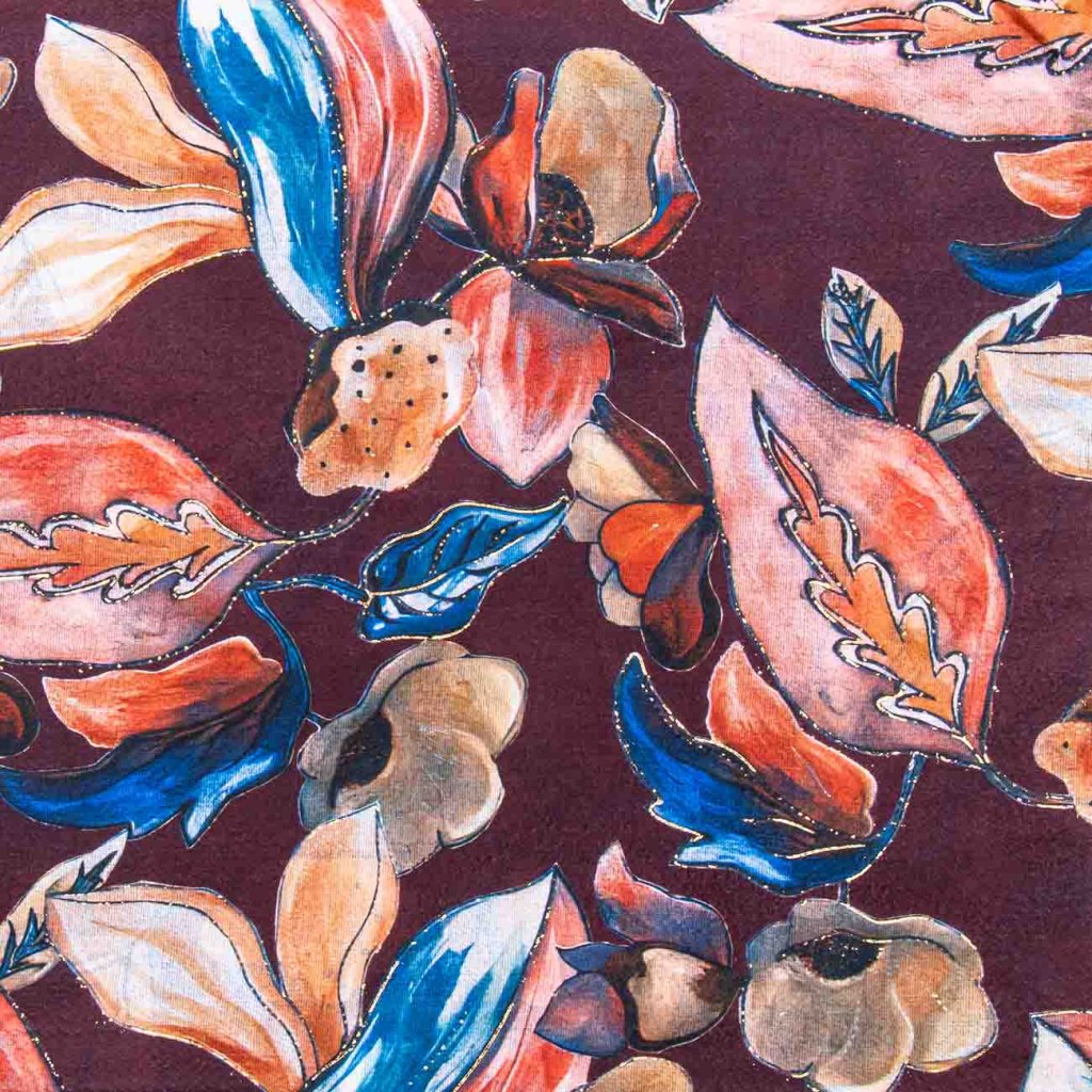 O eșarfă elegantă vișinie, cu un model floral proeminent, completată de un imprimeu auriu delicat, care arată festiv și șic. Ideală pentru zilele mai reci, când vrei să adaugi o pată de culoare și o notă de lux ținutei tale.
