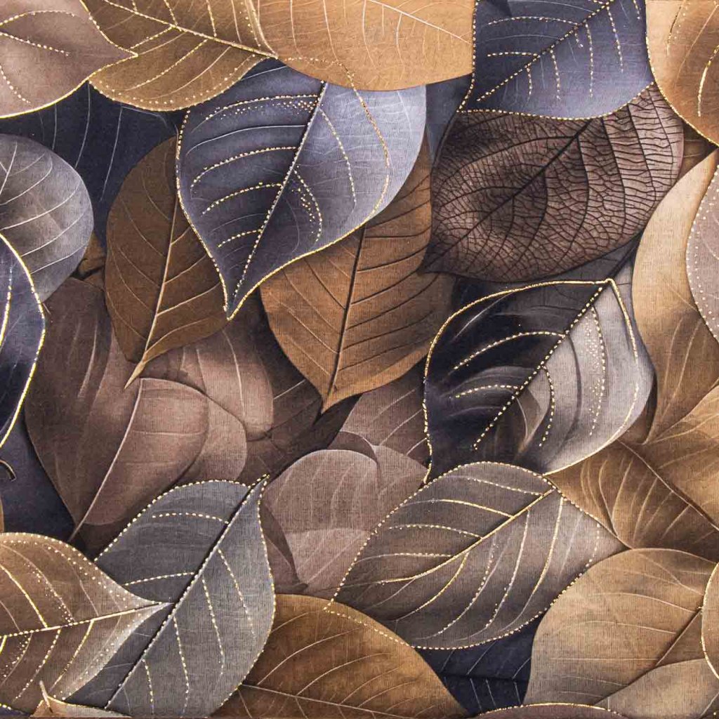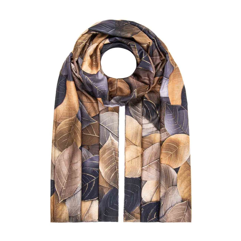 Nuanțele calde de maro cu motiv de frunze creează un aspect confortabil și autumnal. Imprimeul auriu pe o parte adaugă o strălucire delicată eșarfei și un caracter original. Un accesoriu excelent pentru ținute neutre și pământii.