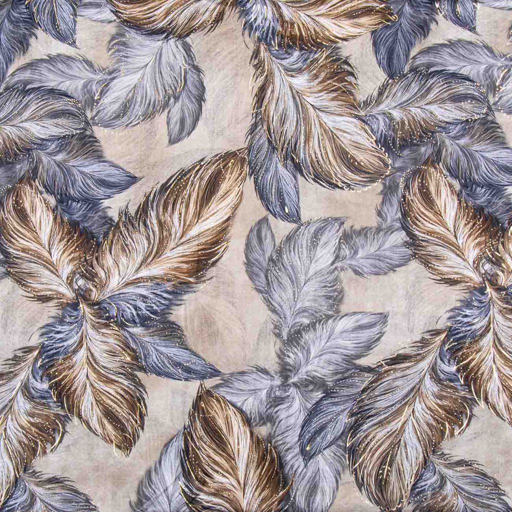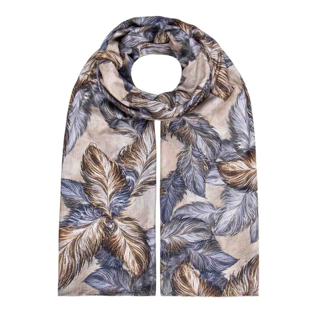 Șal atemporal, bej, cu un motiv delicat de pene. Detaliile aurii adaugă eleganță, pe care o vei aprecia la fiecare ocazie.