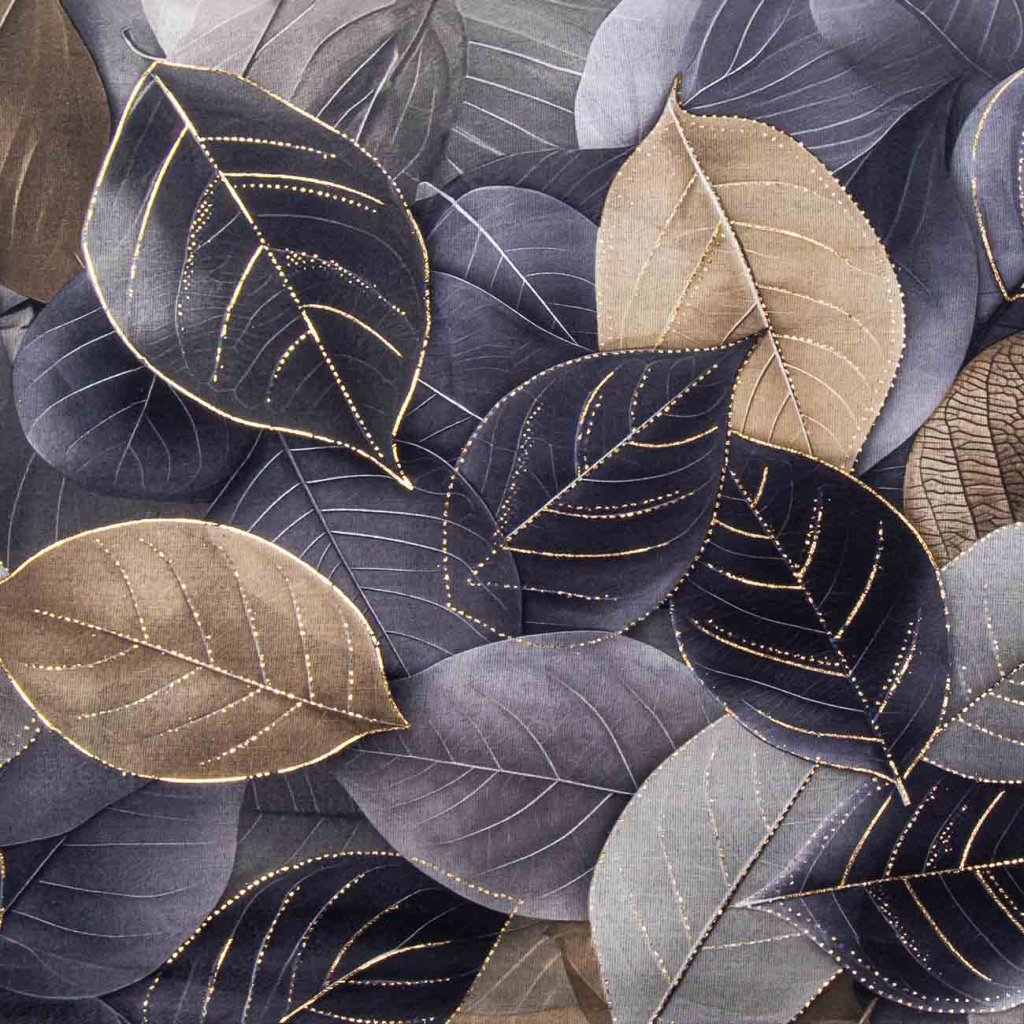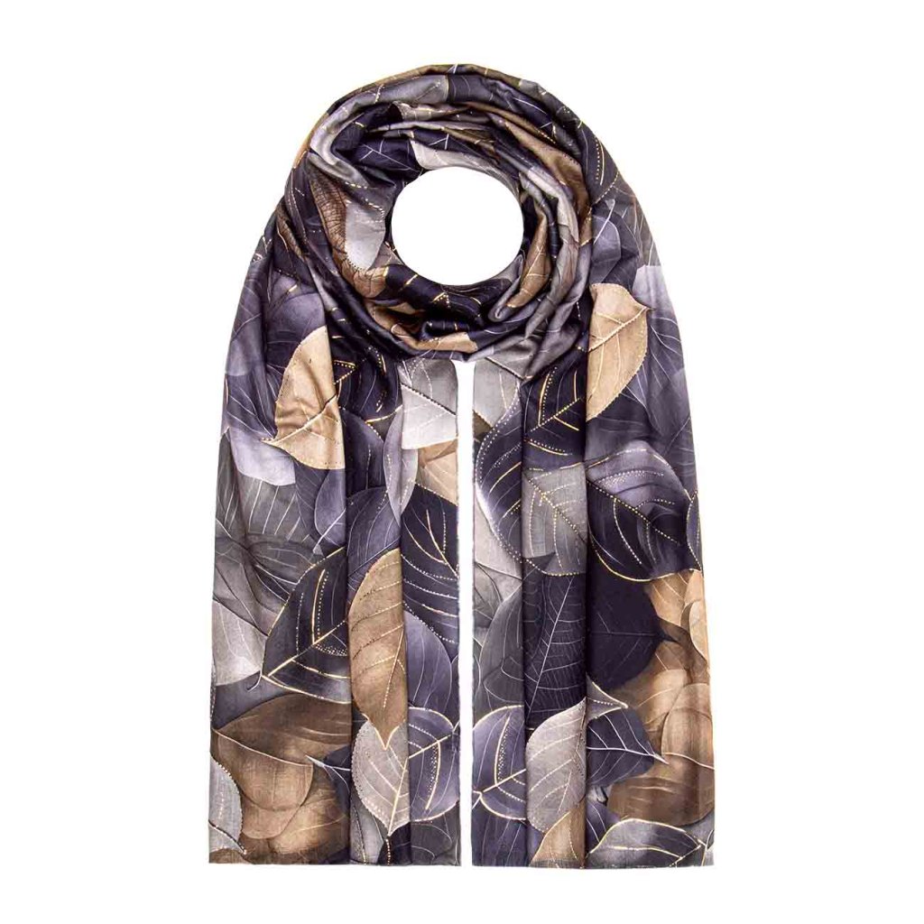Un șal în combinație de negru, gri și bej, cu imprimeu de frunze, arată foarte elegant și atemporal. Decorat pe o parte cu imprimeu auriu, care adaugă o strălucire delicată și un aspect luxos. Se potrivește perfect atât cu ținute formale, cât și casual.