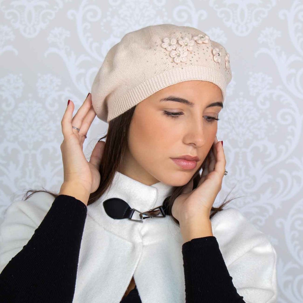 Bască tricotată elegantă cu decorațiuni florale delicate și strasuri mici, va adăuga o notă de eleganță franțuzească ținutei tale. Materialul moale cu amestec de angora este plăcut la atingere și încălzește frumos. Basca se adaptează perfect formei capului și, datorită luciului său discret, arată luxos chiar și în utilizarea de zi cu zi.