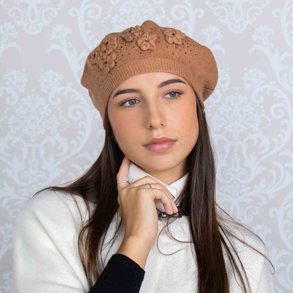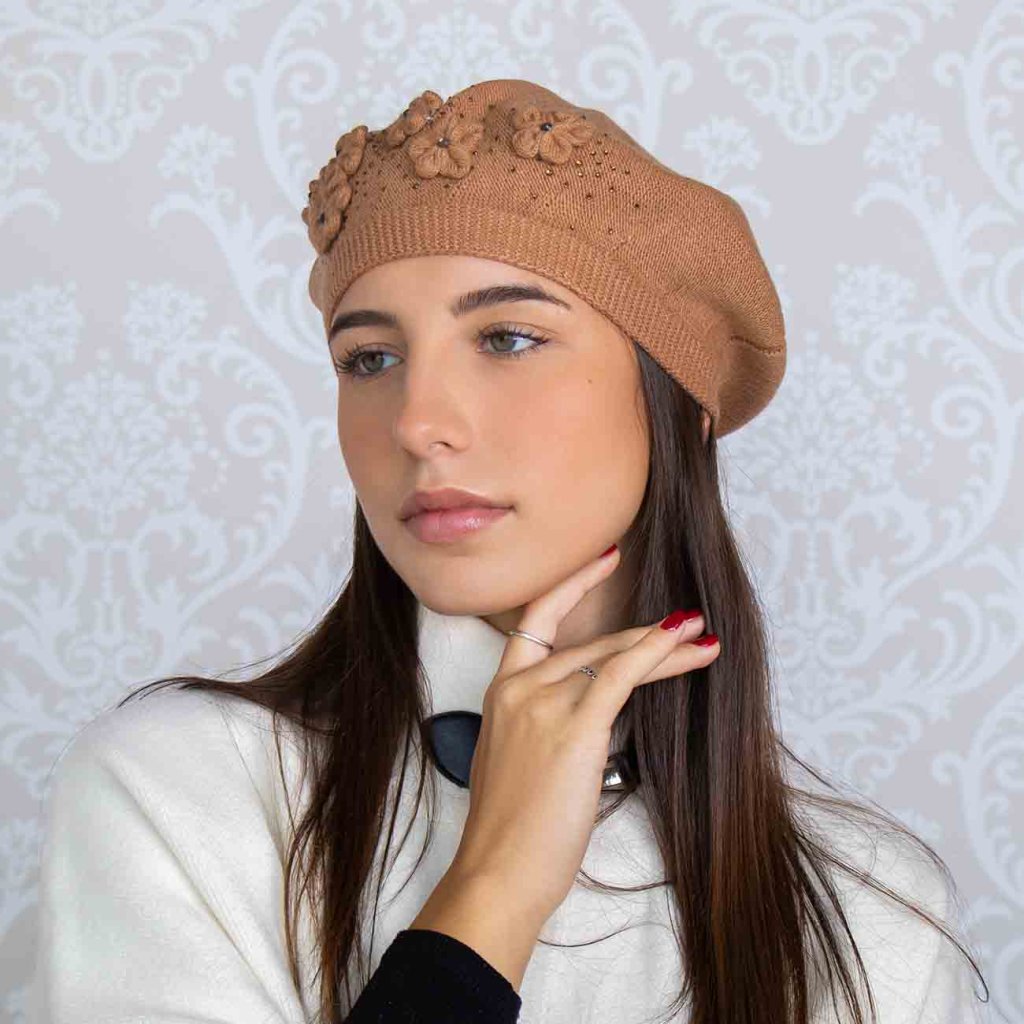 Bască tricotată elegantă cu decorațiuni florale delicate și strasuri mici, va adăuga o notă de eleganță franțuzească ținutei tale. Materialul moale cu amestec de angora este plăcut la atingere și încălzește frumos. Basca se adaptează perfect formei capului și, datorită luciului său discret, arată luxos chiar și în utilizarea de zi cu zi.