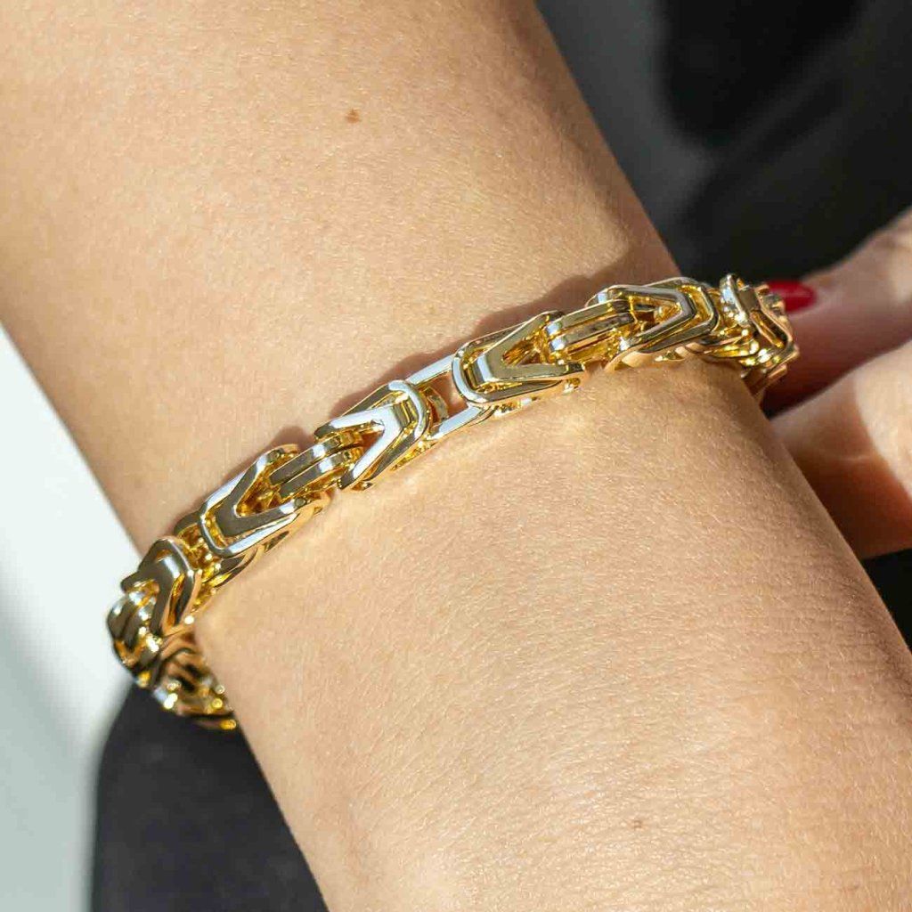 Această brățară distinctivă atrage prin structura sa precisă a verigilor, care creează un aspect dinamic și elegant. Suprafața strălucitoare aurită conferă bijuteriei o notă de lux și subliniază caracterul său atemporal. Un accesoriu ideal pentru cei care doresc să adauge personalitate stilului lor.