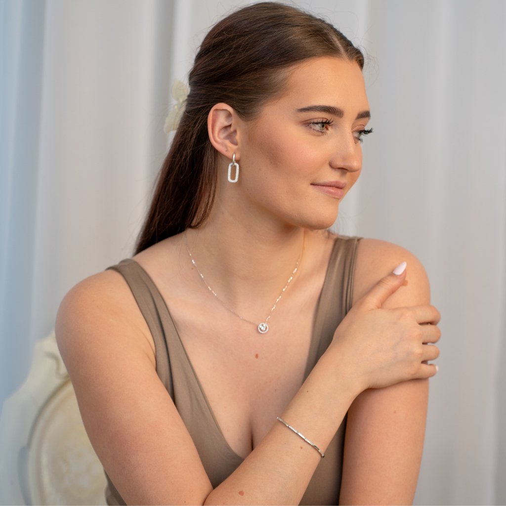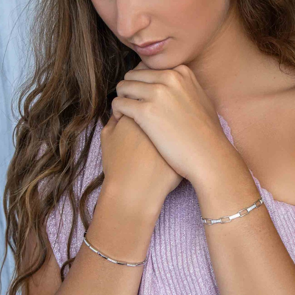 Luxos și sofisticat – această brățară de damă este formată din segmente netede, care alternează regulat cu elemente decorate cu zirconii clare. Strălucirea sa delicată și designul modern o fac un accesoriu ideal atât pentru ținutele de zi cu zi, cât și pentru ocazii festive.