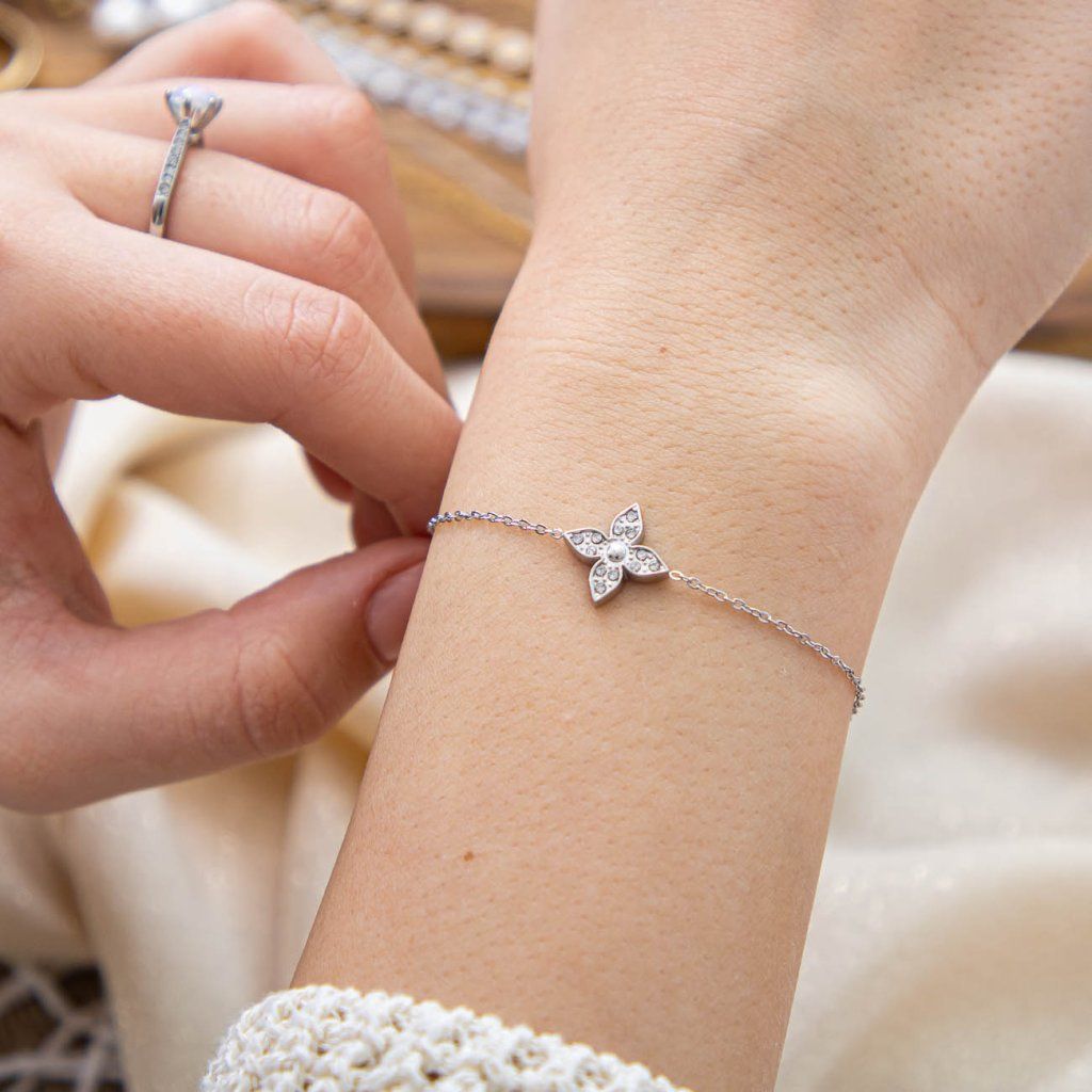 Motivul floral strălucitor va adăuga încheieturii tale un accent delicat, dar distinct. Zirconiile montate cu precizie reflectă lumina la fiecare mișcare și subliniază caracterul atemporal al bijuteriei. Liniile elegante ale lănțișorului vor completa frumos ținutele de zi cu zi, dar și pe cele de ocazie.