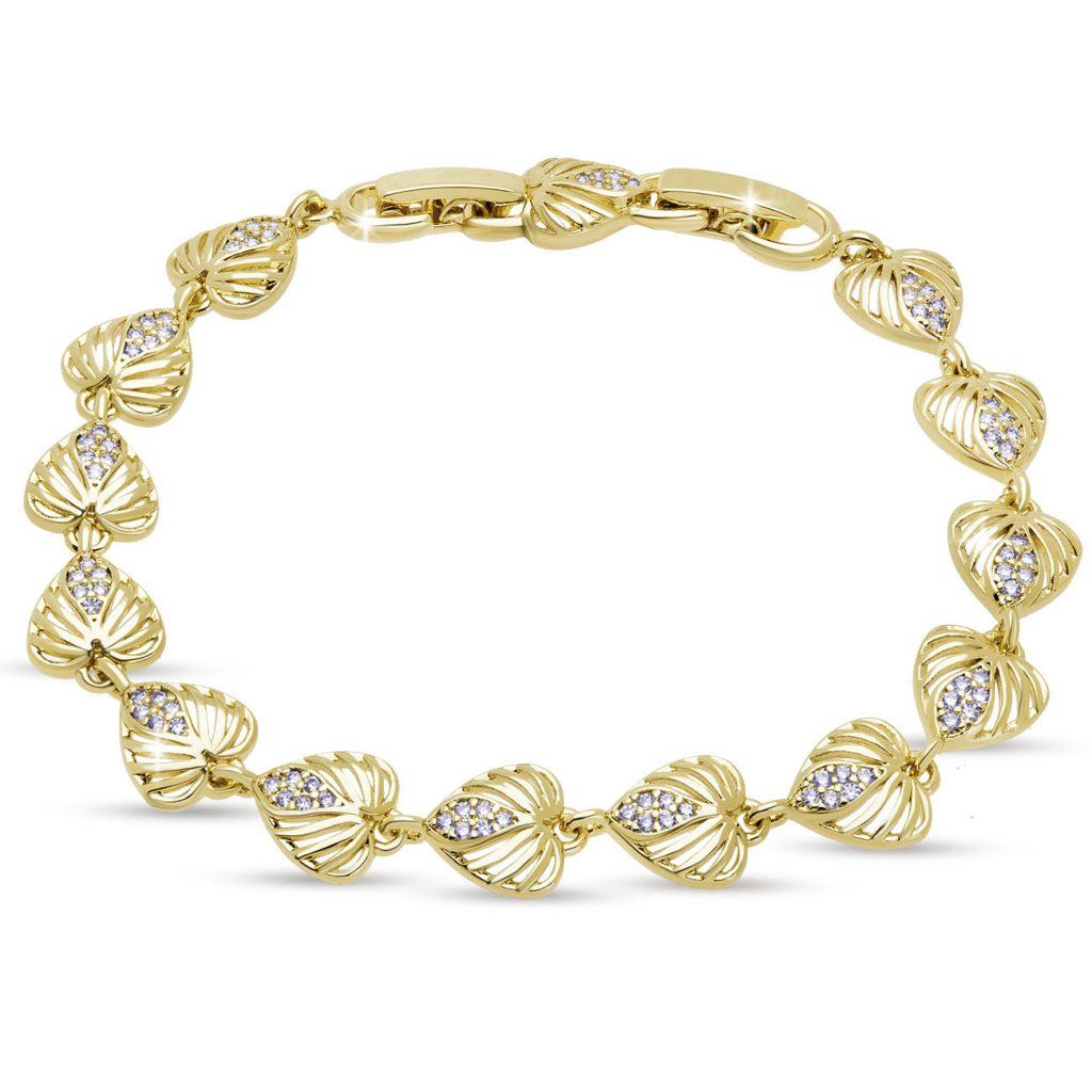 Romantic și rafinat – această brățară este formată din inimioare delicate, cu o structură fin gravată, care o face să pară ușoară și aerisită. Fiecare inimioară este decorată în centru cu pietricele strălucitoare și clare, care adaugă o strălucire discretă brățării. Finisajul din aur adevărat de 14 karate subliniază aspectul luxos și delicatețea designului general.