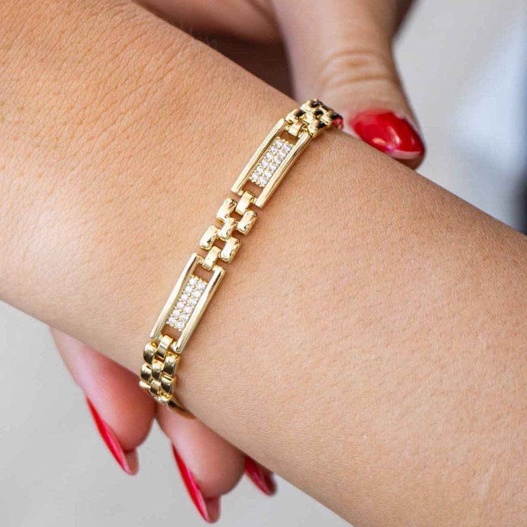 O brățară radiantă care atrage atenția de la prima vedere prin structura sa precisă și strălucirea subtilă. Combinația de legături fine și zirconii strălucitoare creează o bijuterie atemporală, care îți va scoate în evidență stilul cu fiecare ocazie. Un accesoriu distinctiv, dar elegant, pe care îl vei adora.