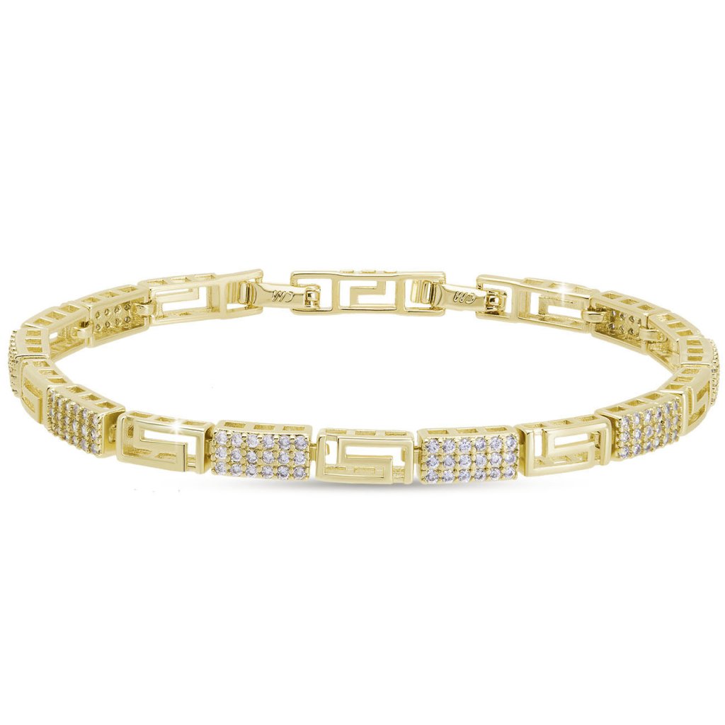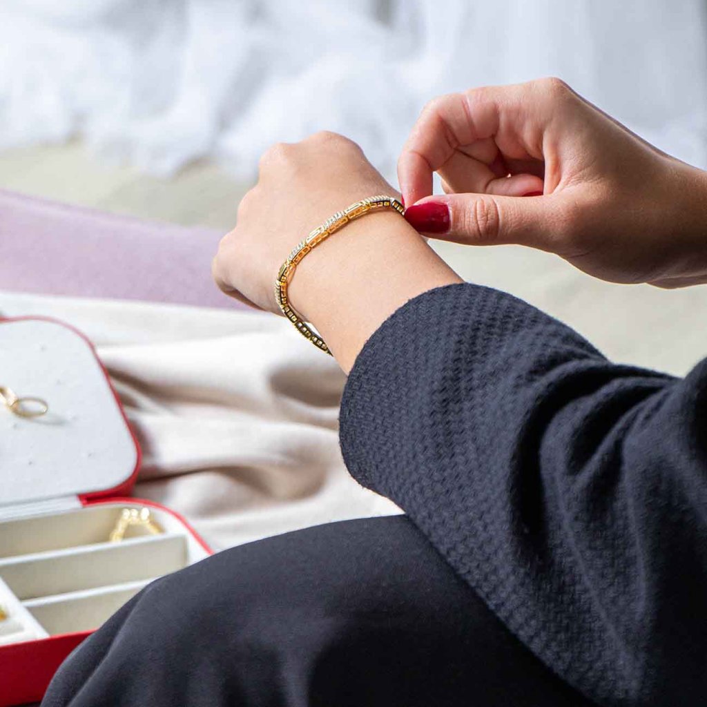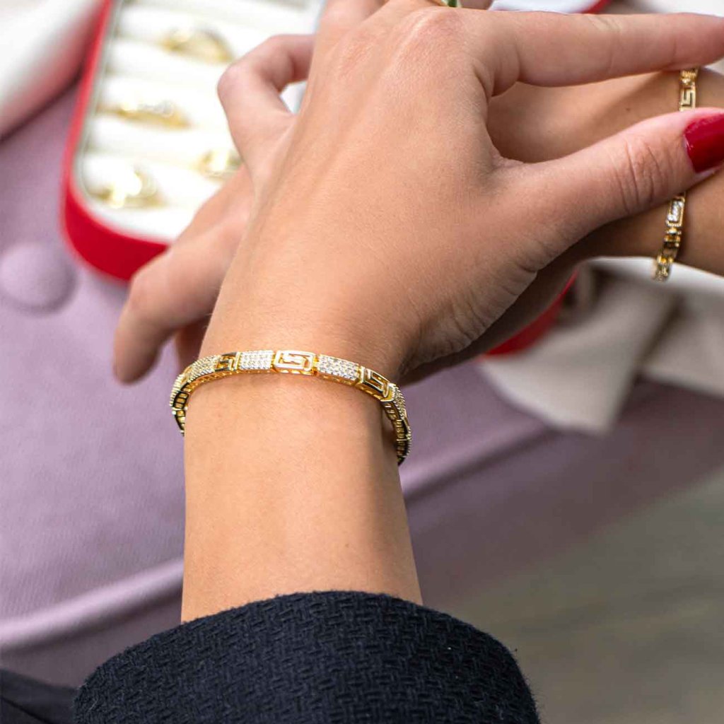 Brățara de lux se remarcă prin modelul geometric prelucrat cu precizie, completat de zirconii lucioase, care adaugă strălucire și expresivitate bijuteriei. Designul combină eleganța modernă cu stilul atemporal – o alegere ideală pentru purtarea de zi cu zi și ocazii speciale. Datorită detaliilor bine gândite, atrage atenția de la prima vedere și completează frumos orice ținută.