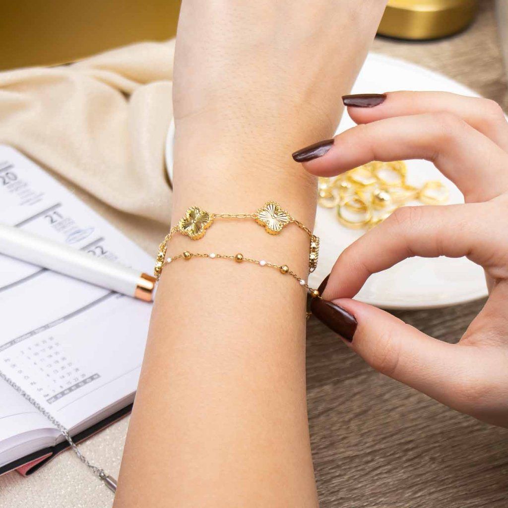Brățară placată cu aur din oțel chirurgical cu detalii albe. Delicatețea, strălucirea și designul atemporal, un accesoriu pentru un stil zilnic elegant.