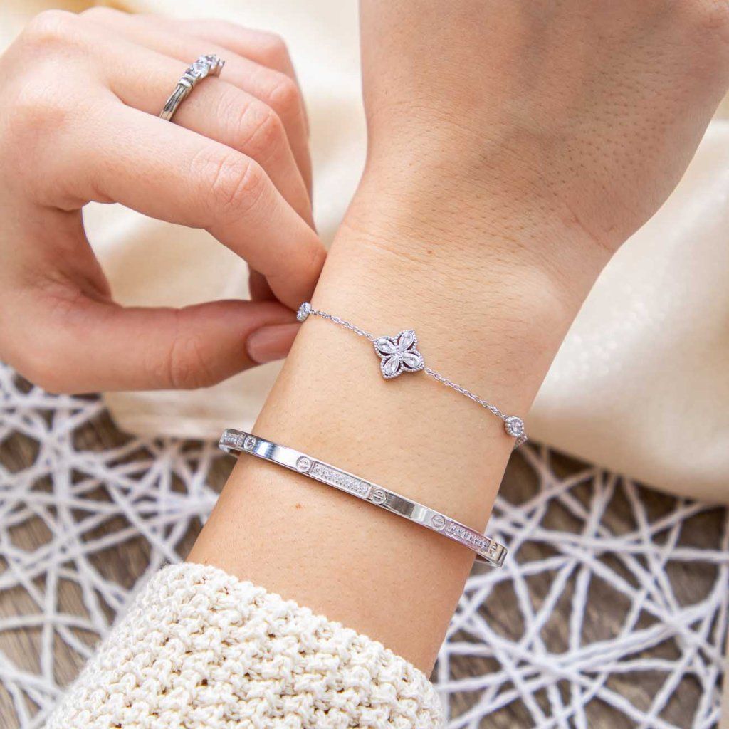 Un detaliu floral delicat, realizat cu precizie, vă va lumina încheietura mâinii la fiecare mișcare. Cristalele strălucitoare creează o sclipire elegantă și subliniază caracterul atemporal al bijuteriei. Această brățară are un aspect delicat, dar totuși distinct.