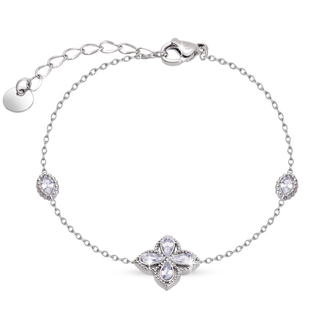 Brățară din oțel chirurgical cu floare și zirconii, lungime 16,5 + 3,5 cm. Un accesoriu delicat, strălucitor și atemporal, cu închidere tip carabineră.
