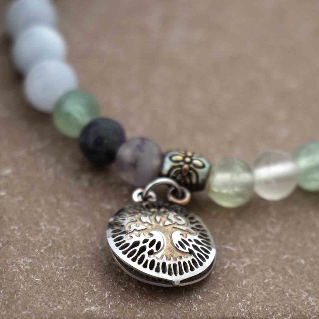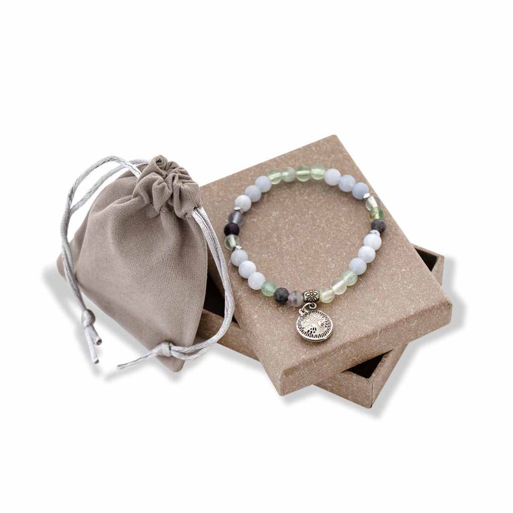 Brățară elegantă realizată din mărgele fine de acvamarin, în combinație cu minerale în nuanțe deschise de albastru și verzui. Este completată de componente metalice din oțel chirurgical și un pandantiv cu simbolul Arborelui Vieții, care adaugă bijuteriei o semnificație și o eleganță unică. Datorită elasticului flexibil, brățara se adaptează ușor la încheietura mâinii și este foarte confortabilă pentru purtarea de zi cu zi.