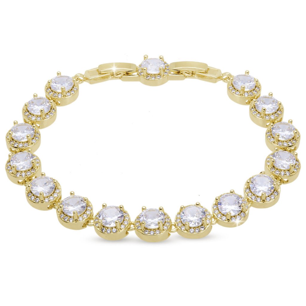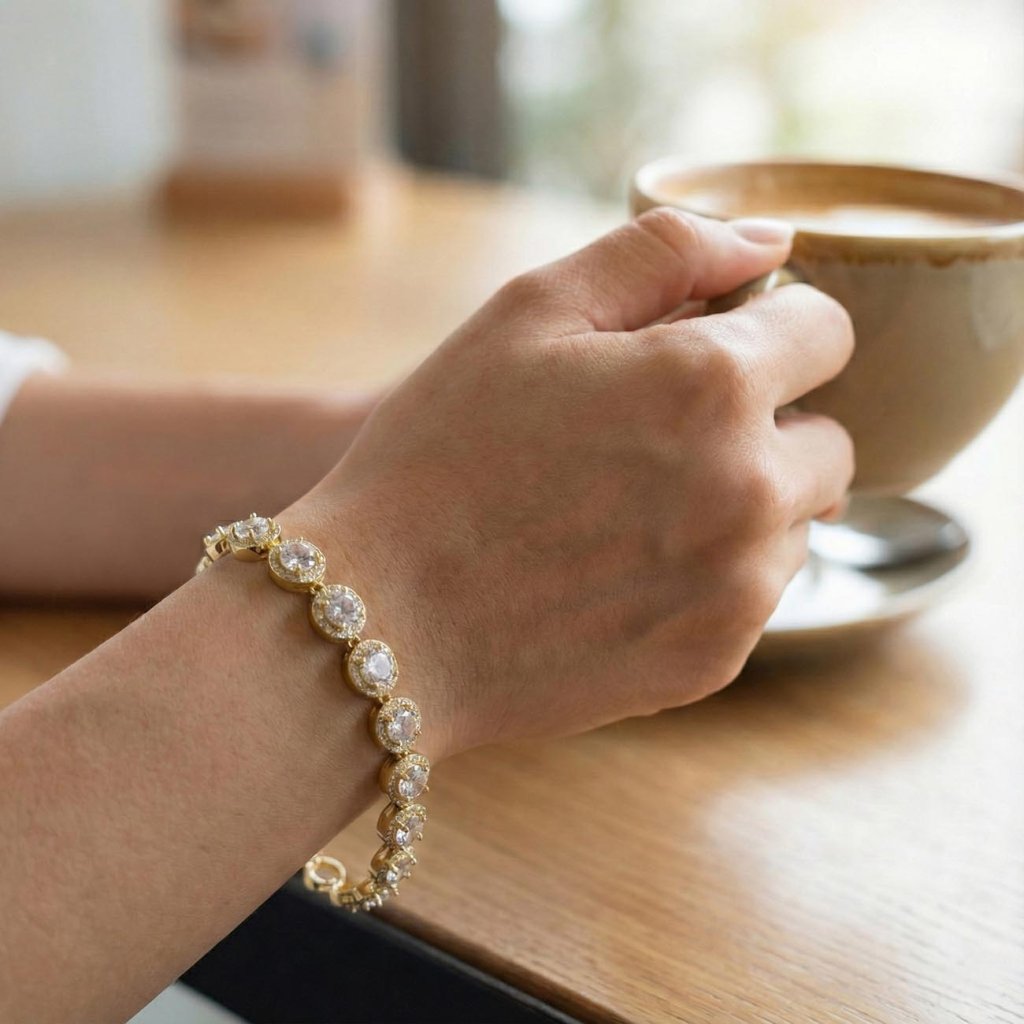 Elegant brățară placată cu aur de 14K, decorată cu zale proeminente și zirconii strălucitoare, emană un aspect luxos și modern.