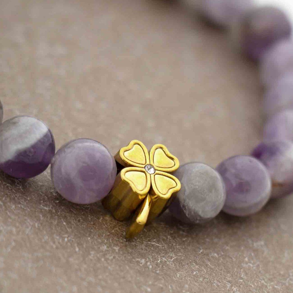 Brățară elegantă, realizată din mărgele de ametist violet fin, care adaugă o notă de lux, liniște și armonie bijuteriei. Piesa centrală este decorată cu o componentă din oțel chirurgical în formă de trifoi cu patru foi, care ridică bijuteria la un accesoriu elegant. Datorită elasticului flexibil, brățara se adaptează ușor la încheietura mâinii și este confortabilă pentru purtarea de zi cu zi.