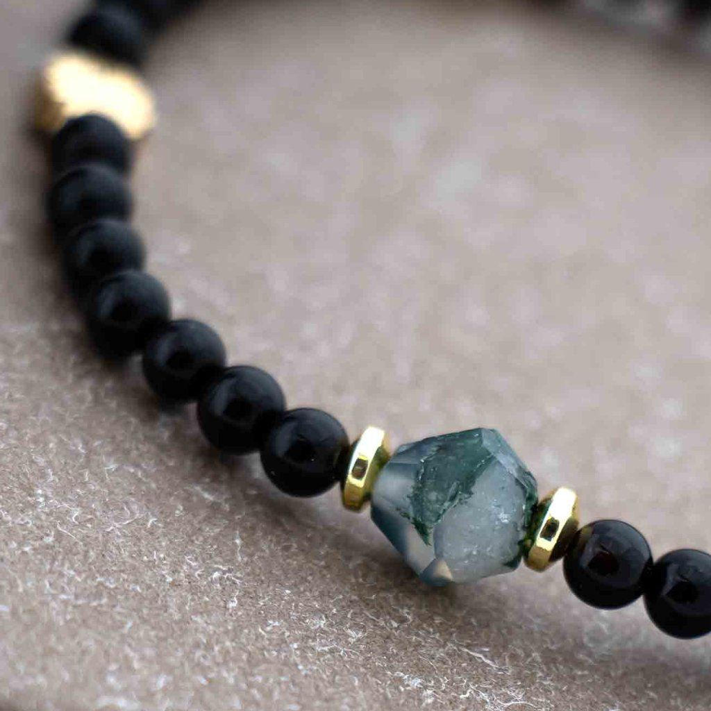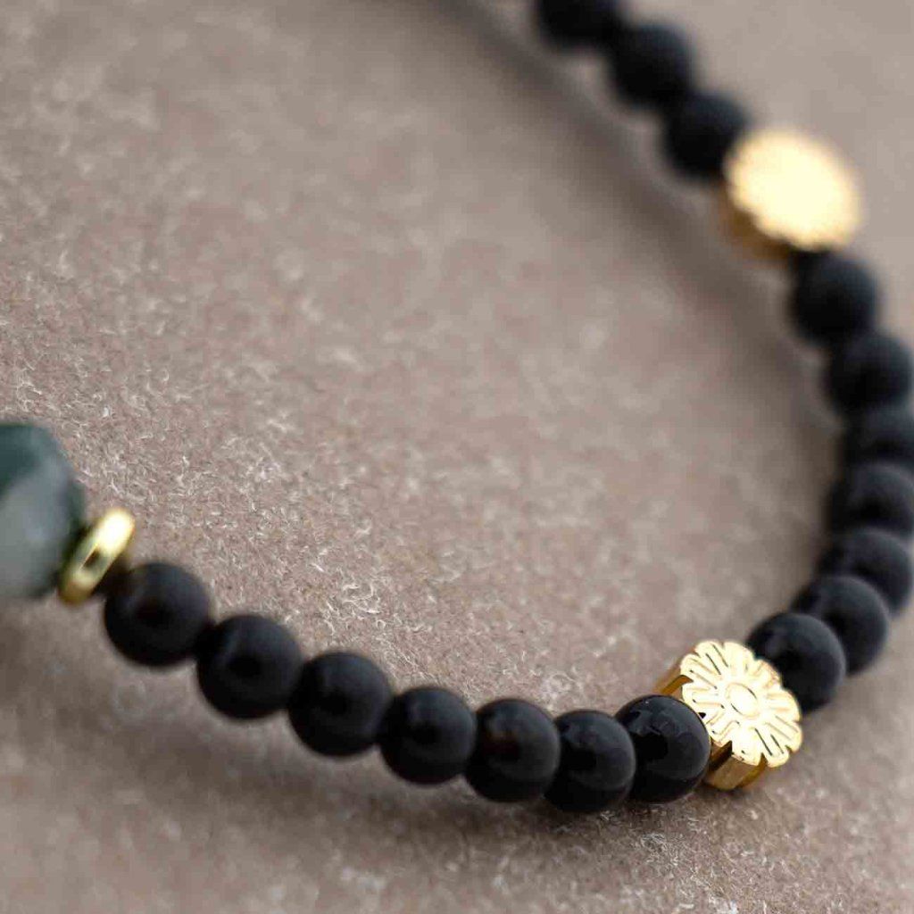 Brățară elegantă realizată din mărgele fine de onix, care conferă bijuteriei un aspect luxos și atemporal. Piesa centrală este o piatră șlefuită neregulat într-o culoare aleatorie de la deschis la închis în combinație cu componente metalice din oțel chirurgical de culoare aurie. Datorită elasticului flexibil, brățara se adaptează ușor la încheietura mâinii și este foarte confortabilă pentru purtarea zilnică.