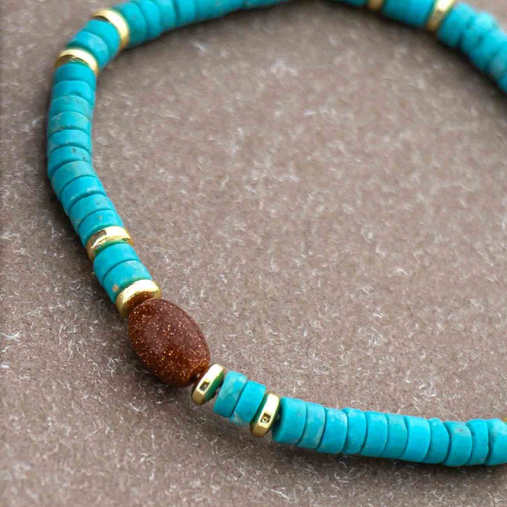 Brățară elegantă realizată din mărgele turcoaz în formă de disc plat, care sunt înșirate pe o bandă elastică flexibilă. Centrul brățării este decorat cu o piatră ovală de piatră de nisip aurie, al cărei luciu delicat arată luxos și adaugă un aspect original bijuteriei. Este completată de componente metalice aurii din oțel chirurgical, care garantează rezistență și durată lungă de viață.