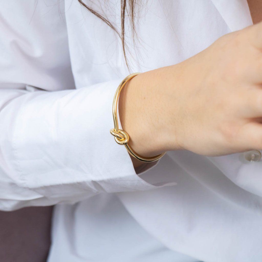 Brățară elegantă cu un nod simplu ca simbol al conexiunii și al puterii. Designul deschis permite o potrivire ușoară și ajustarea la încheietură. Ideală pentru iubitoarele de linii curate și stil modern.