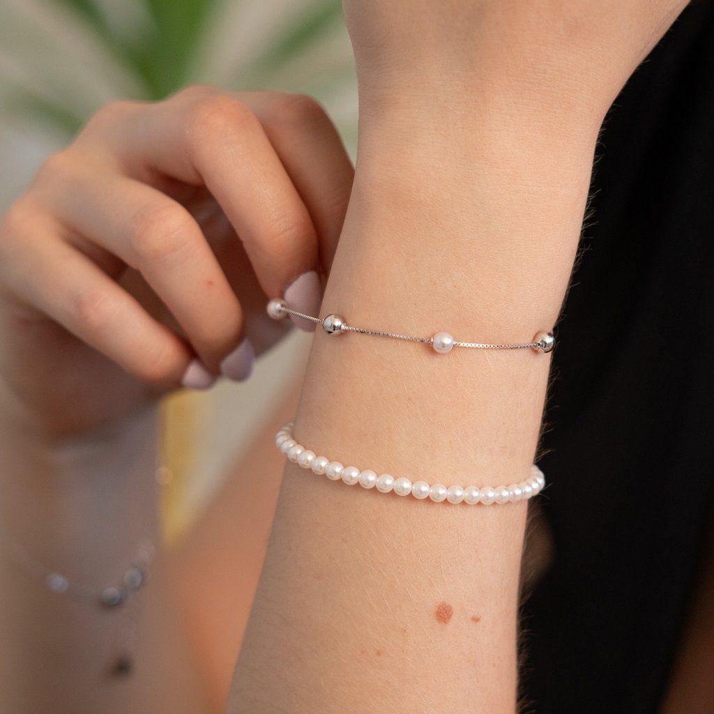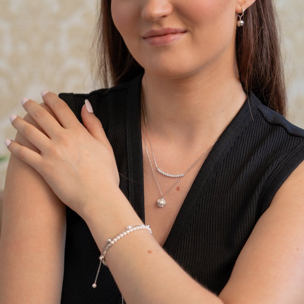 Brățară cu perle și mărgele argintii strălucitoare. Brățara are o închidere cu carabină și este echipată cu o extensie care vă permite să ajustați confortabil circumferința brățării.