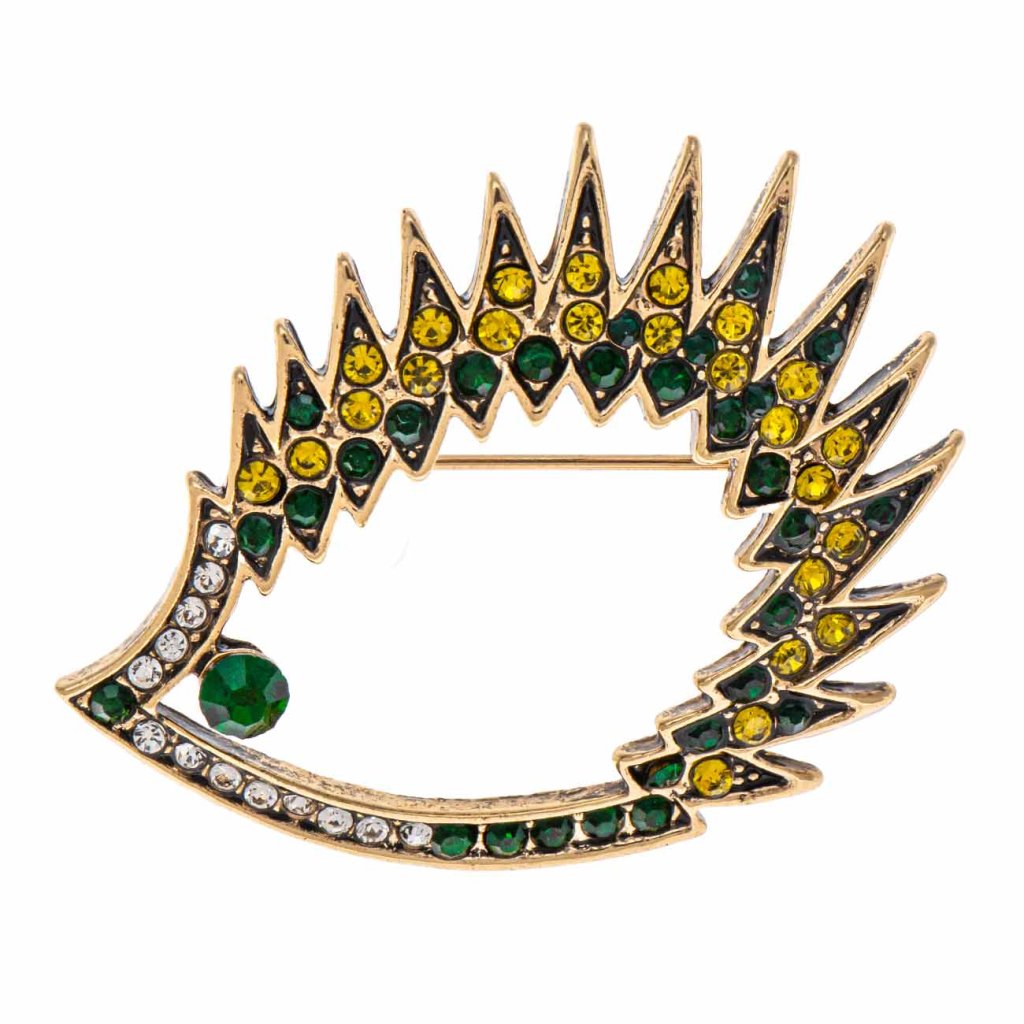 Broșa statement în formă de arici, decorată cu cristale verzi și galbene în tonuri aurii, este un accesoriu stilat pentru orice ocazie. Pietrele strălucitoare adaugă o scânteie și originalitate bijuteriei, în timp ce baza aurie subliniază eleganța designului general.