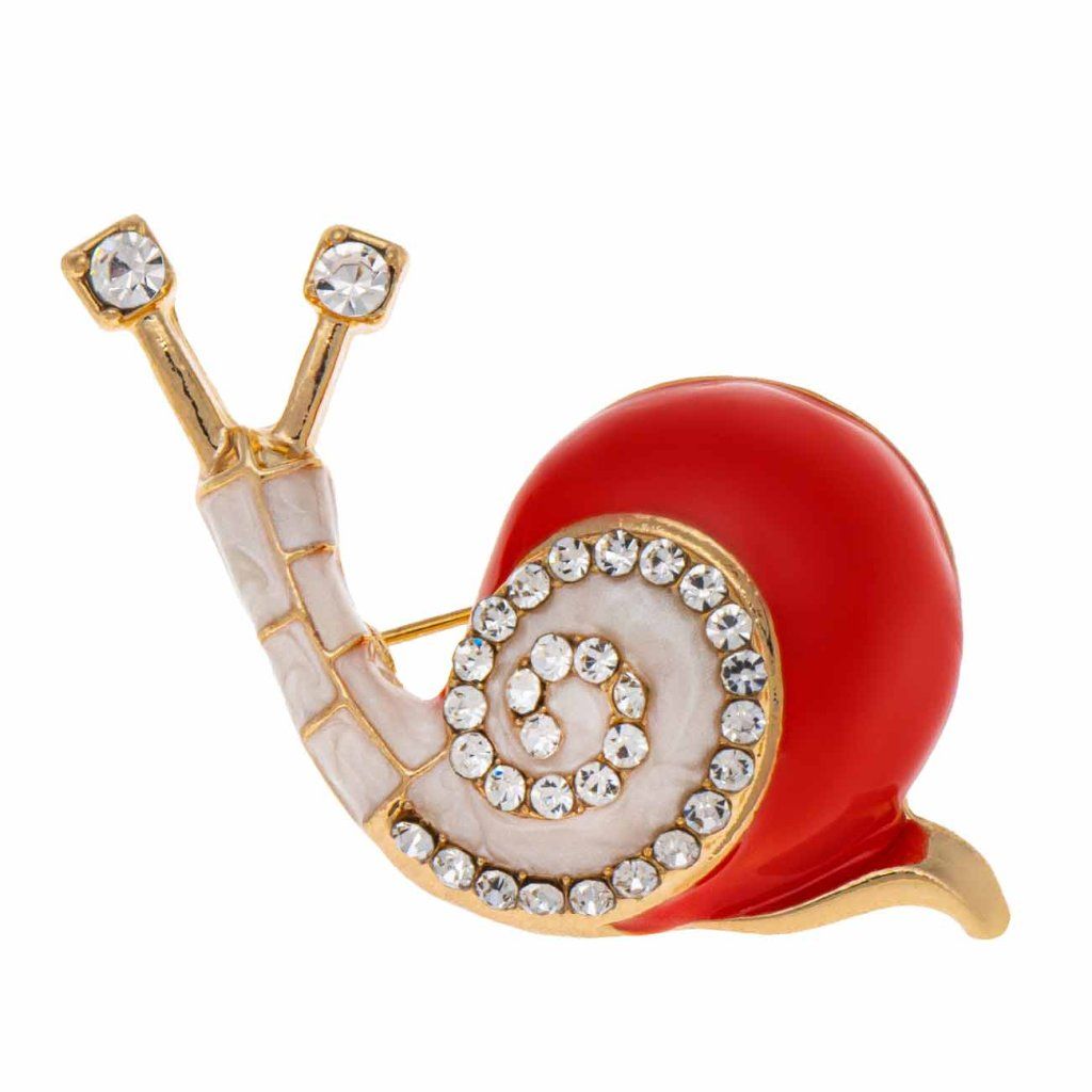 Broșă originală în formă de melc, cu o carapace roșie distinctivă și un corp decorat cu pietre strălucitoare transparente. Un accesoriu stilat și jucăuș, care va lumina o haină, o eșarfă sau o geantă.