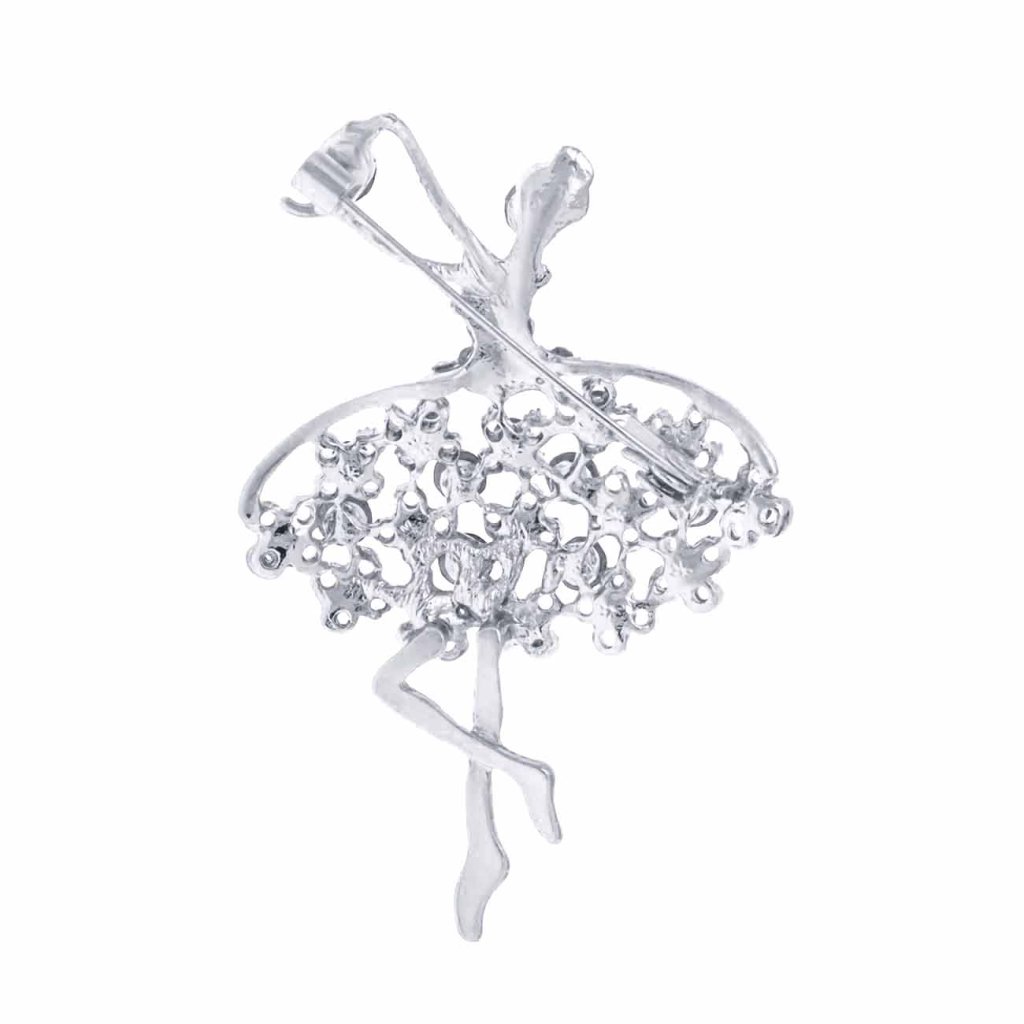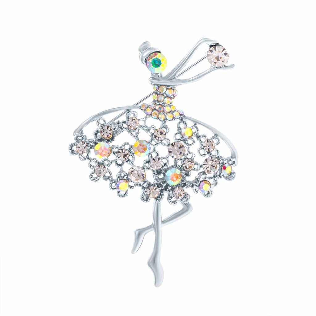 Broșa fermecătoare în formă de balerină reprezintă grație, frumusețe și delicatețe. Fusta bogat decorată este împodobită cu zirconii clare și irizate, care creează un mozaic strălucitor și reflectă frumos lumina în mișcare. Detaliile fine ale siluetei și piatra strălucitoare din mână conferă broșei un aspect luxos. Va arăta excelent pe rochii, bluze și sacouri, unde va deveni un accesoriu original.