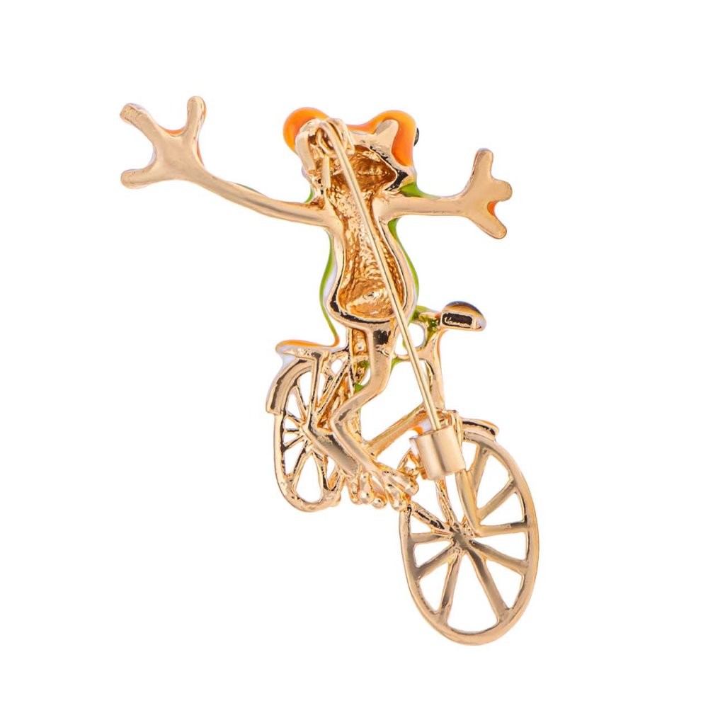 Brosa originala cu motivul unei broaste calare pe o bicicleta va atrage imediat prin designul sau jucaus si culorile vibrante. Finisajul lucios din email confera bijuteriei vitalitate, in timp ce detaliile delicate din metal ale bicicletei subliniaza prelucrarea precisa. Brosa pare usoara, amuzanta si in acelasi timp stilata – un accesoriu ideal pentru cei care nu se tem sa iasa in evidenta si sa adauge un caracter personal tinutei.