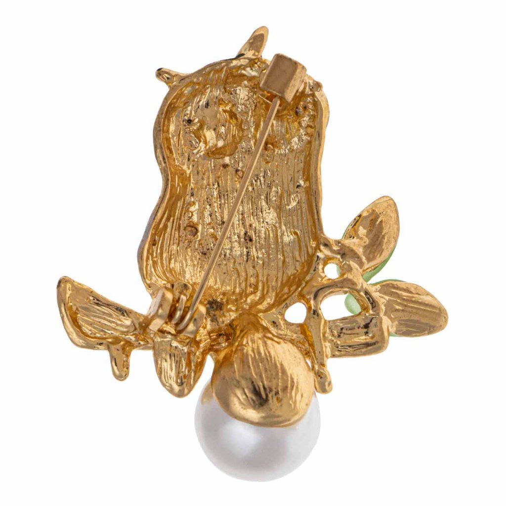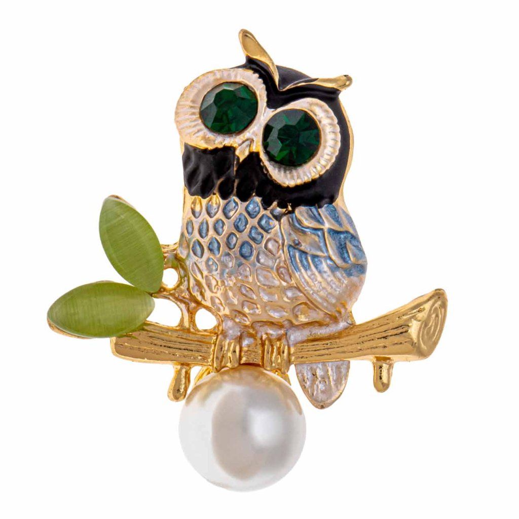 Broșă detaliată în formă de bufniță așezată pe o ramură, completată cu ochi de smarald verde, frunze delicate și o perlă decorativă. Un accesoriu distinctiv pentru iubitorii de natură, un simbol al înțelepciunii și al originalității.