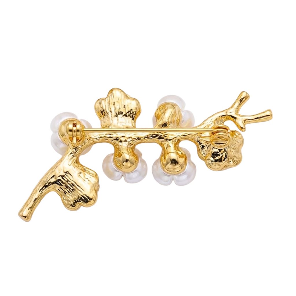 Brosa elegantă în formă de crenguță înflorită va impresiona prin combinația armonioasă de flori delicate de sidef și metal de bijuterii lucrat artistic. Florile detaliate arată ușor și aerisit, în timp ce structura metalică conferă bijuteriei un caracter de noblețe. Broșa arată minunat pe un palton, sacou sau eșarfă și va deveni un accesoriu discret, dar izbitor, pentru o ținută de zi cu zi sau una mai festivă.