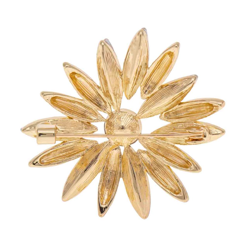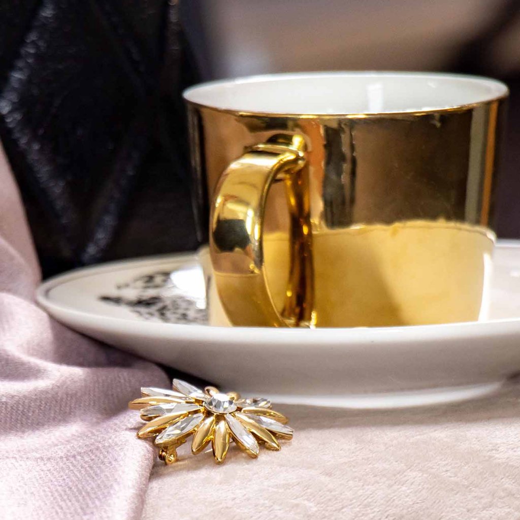 Broșa elegantă în formă de floare radiază prin originalitatea și luciul său delicat. Fiecare petală alternează metalul neted și zirconii clare șlefuite în formă de picătură, care împreună creează un design armonios și luxos. Centrul florii este decorat cu o piatră mai mare, strălucitoare, care reflectă frumos lumina și adaugă o notă sclipitoare bijuteriei. Broșa arată izbitor și totuși rămâne de bun gust – un accesoriu ideal pentru ținute festive și elegante.