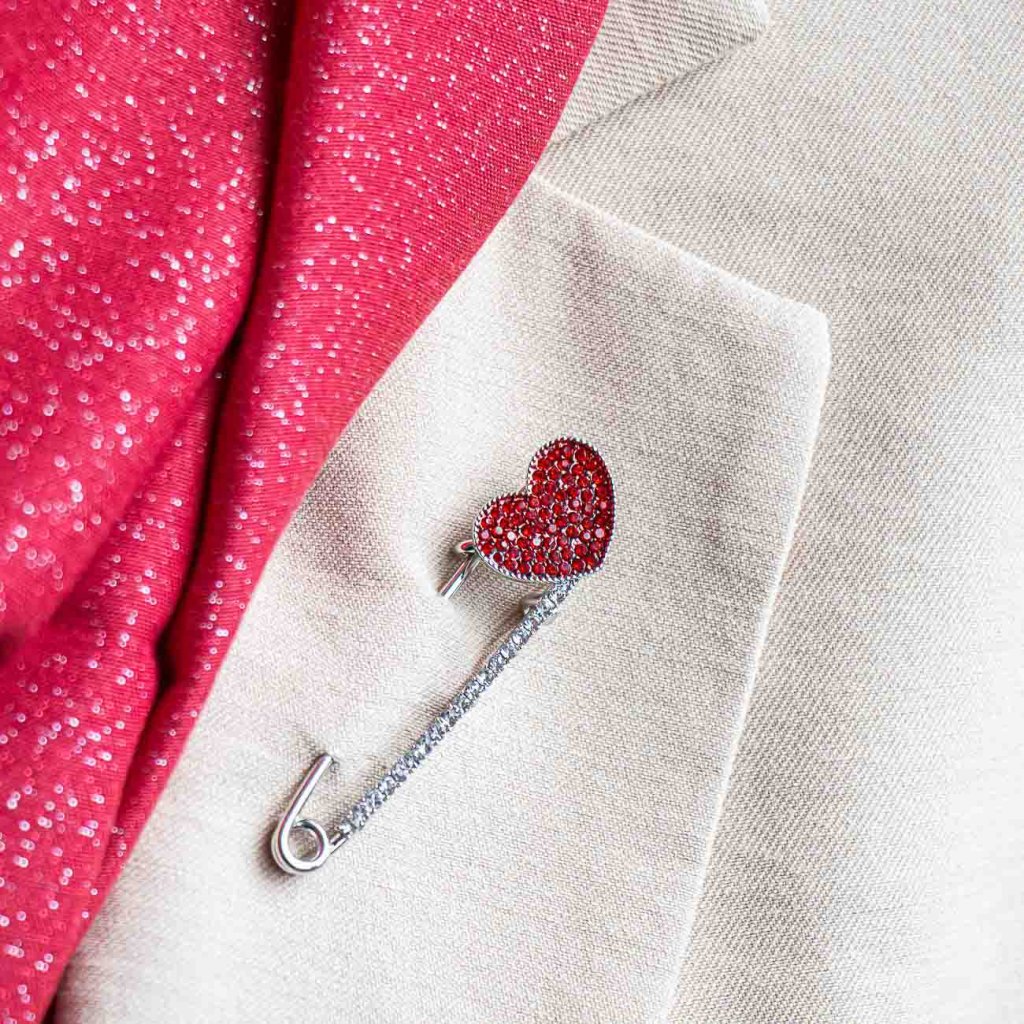 Brosă elegantă inspirată de forma unui ac de siguranță, ce impresionează prin designul modern și detaliul distinctiv al unei inimi roșii, împodobită cu zirconii strălucitoare. Linia delicată, completată de o serie de zirconii transparente, conferă un aspect elegant și echilibrat, în timp ce inima adaugă caracterului bijuteriei o notă emoțională și personală. Un accesoriu ideal pentru palton, sacou sau eșarfă, care revitalizează discret orice ținută și atrage atenția.