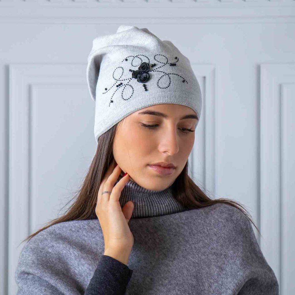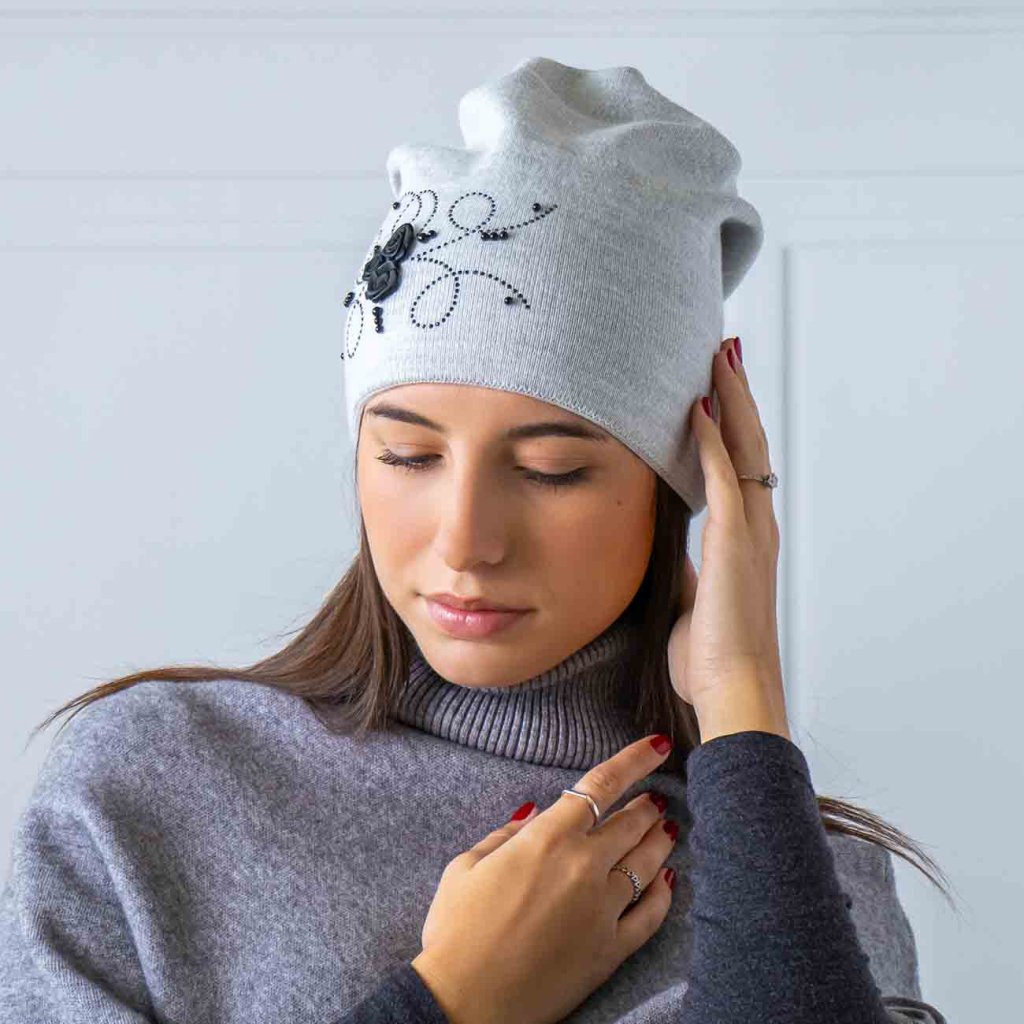 Căciulă tricotată de damă cu roze și strasuri, gri deschis 7100374-6