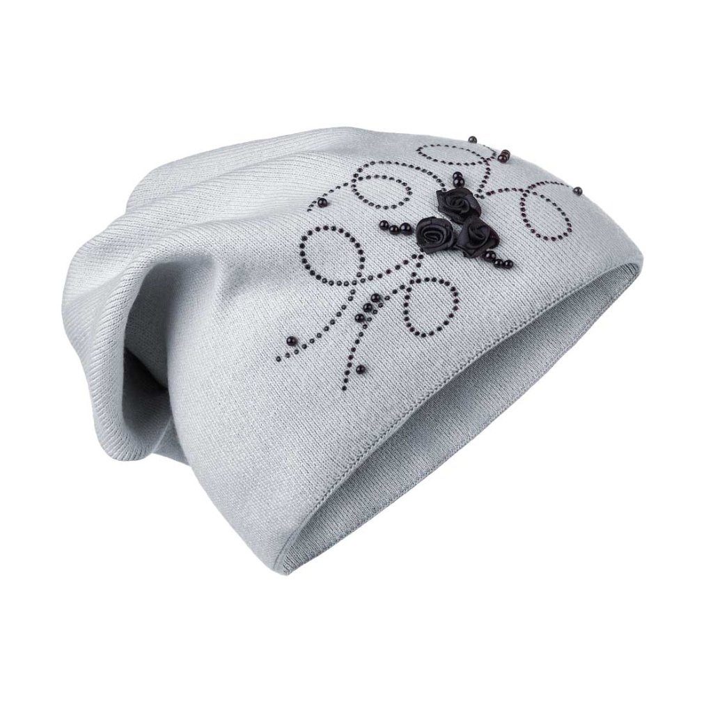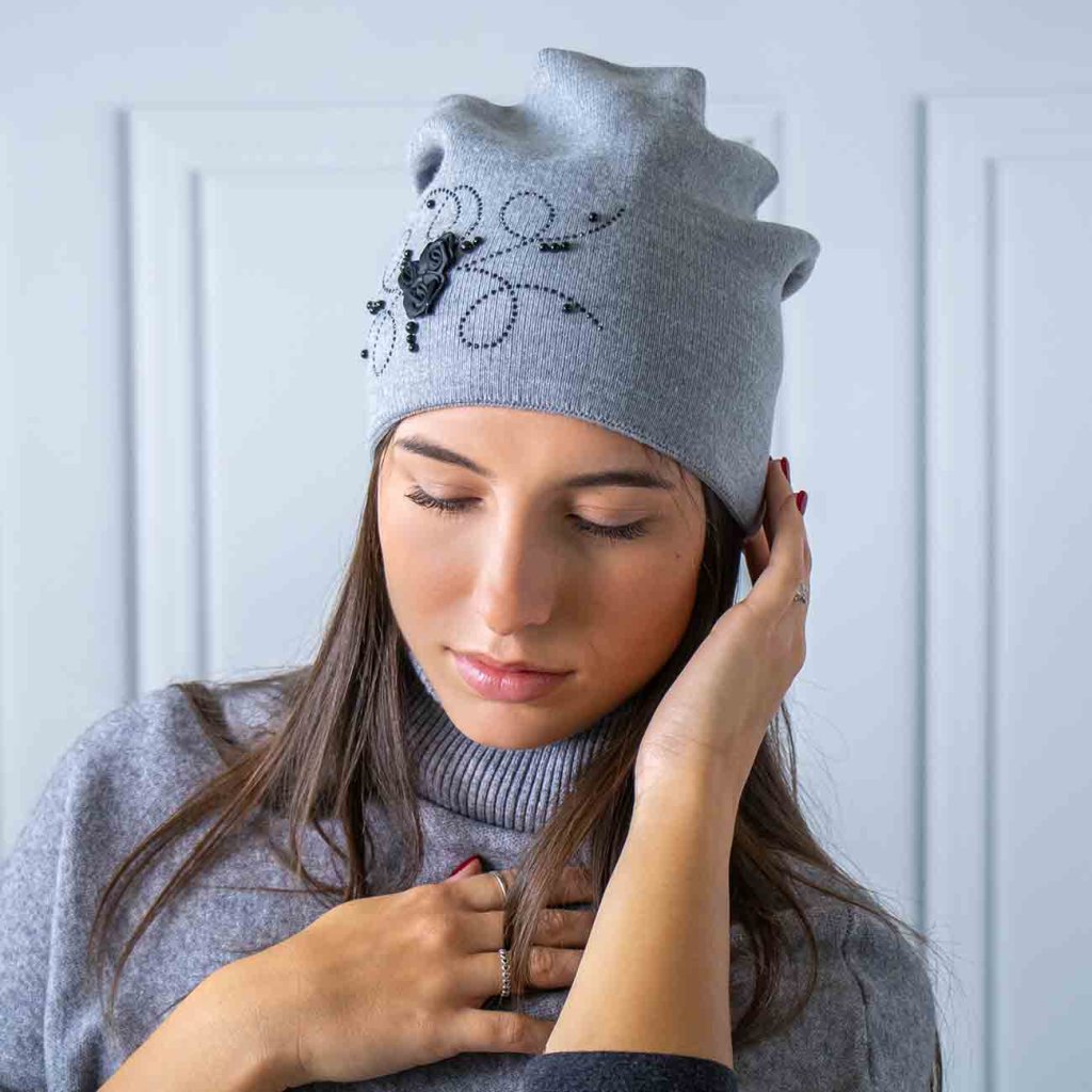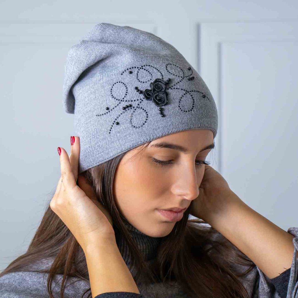 Căciulă tricotată de damă cu roze și strasuri, gri închis 7100374-7