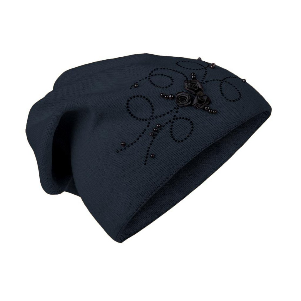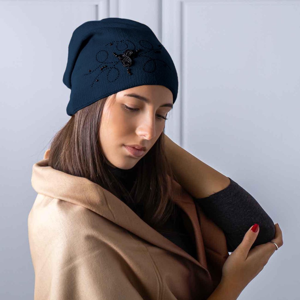 Căciulă tricotată de damă cu trandafiri și pietre, bleumarin 7100374-9