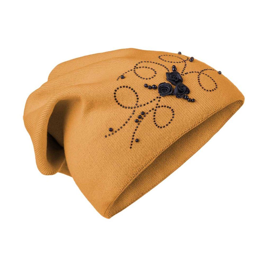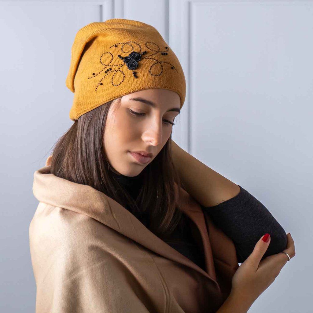 Căciulă tricotată de damă cu trandafiri și strasuri, muștar 7100374-5