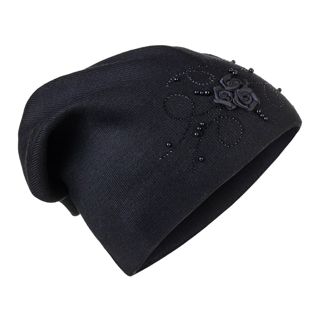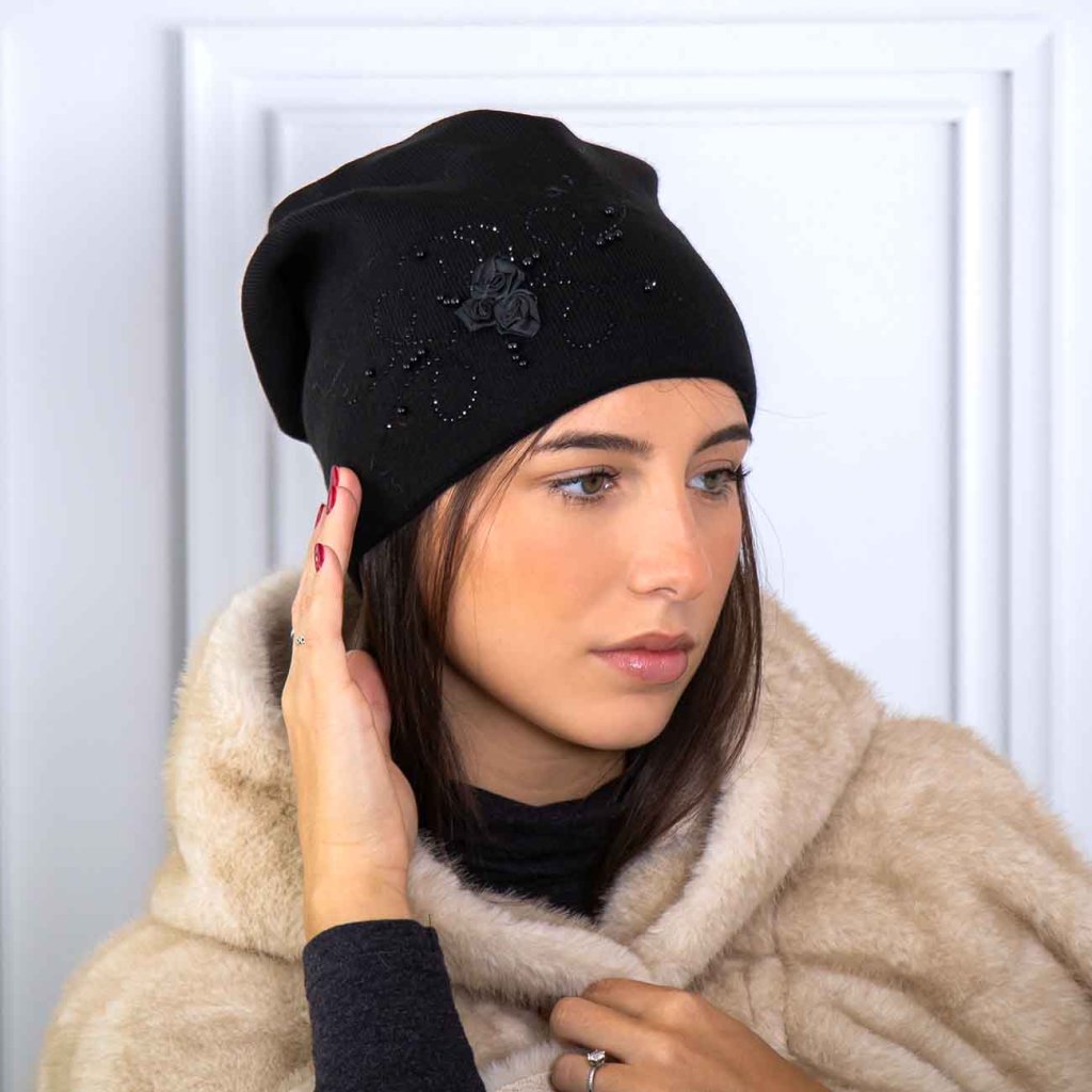 Căciulă tricotată de damă cu trandafiri și strasuri 7100374, de culoare neagră