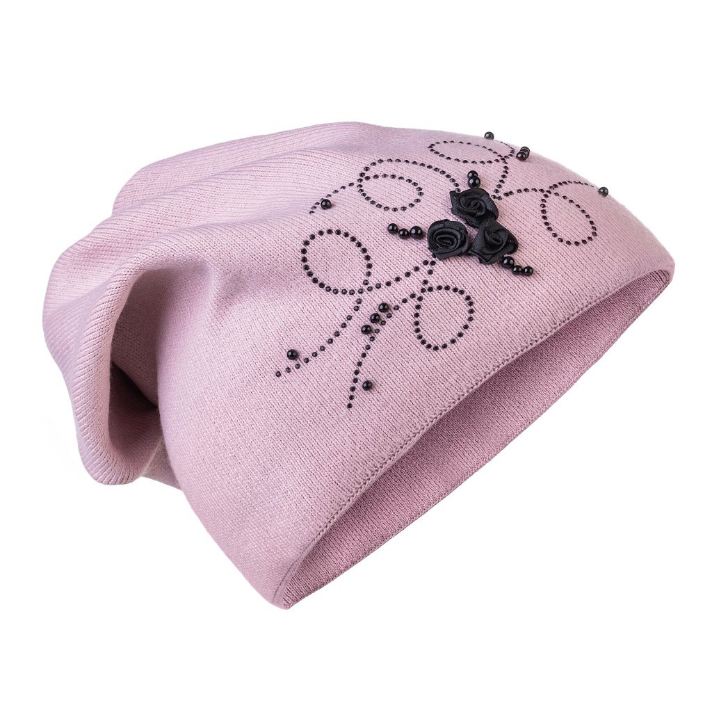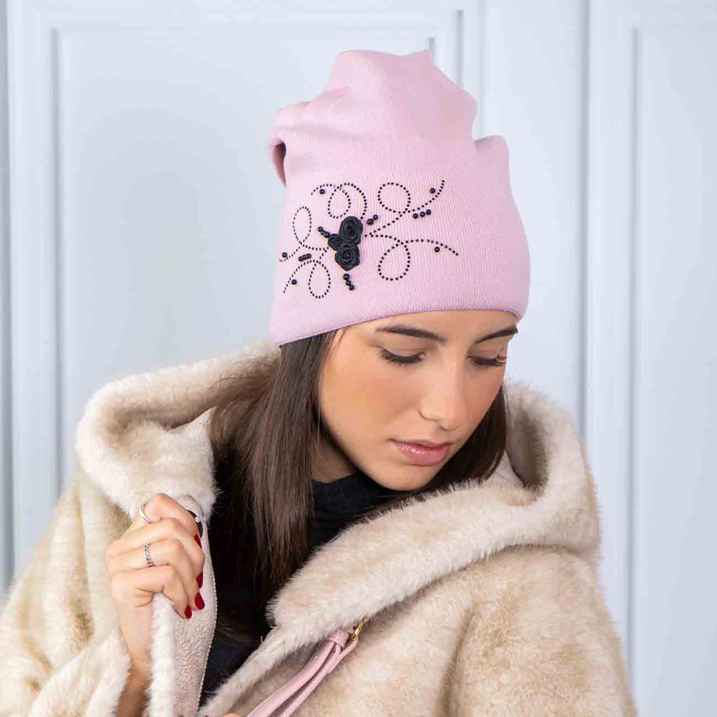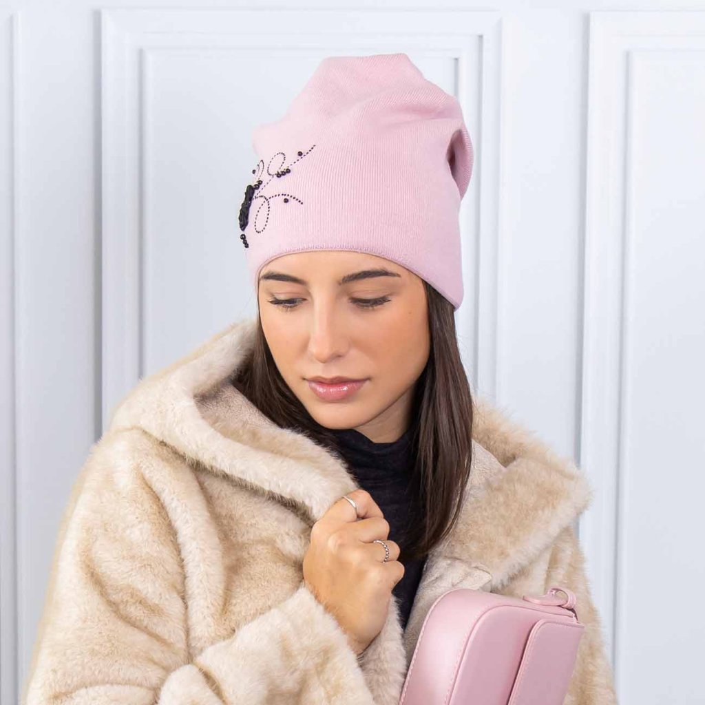 Căciulă tricotată de damă cu trandafiri și strasuri 7100374-3, culoare roz
