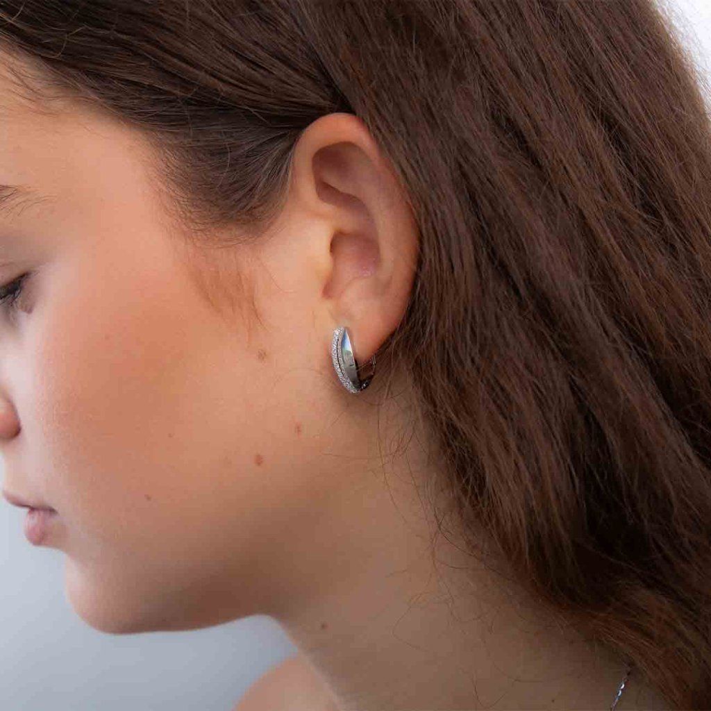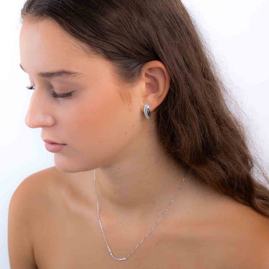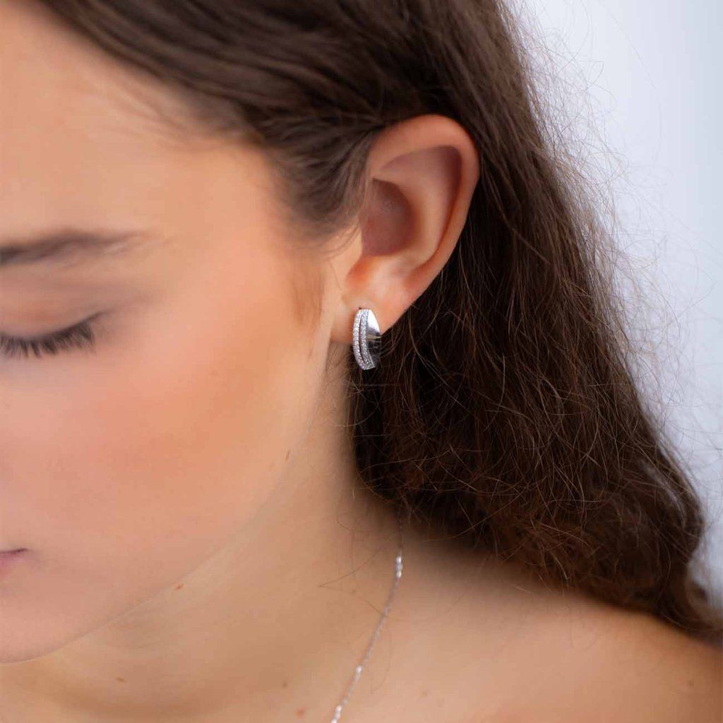 Cercei eleganți cu un design lucios și rotunjit, decorați cu două linii de zirconii clare, inserate cu precizie. Design modern cu o strălucire discretă, care va evidenția orice ținută, de zi cu zi sau festivă.