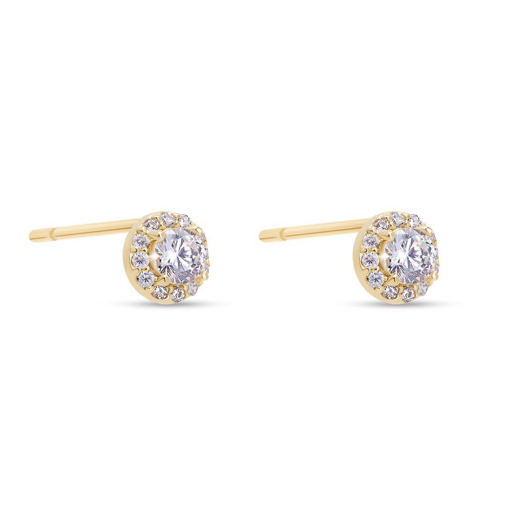 Cerceii clasici cu zirconiu rotund înconjurat de pietre mai mici în stil halo impresionează prin delicatețea și farmecul lor atemporal. Confecționați din argint veritabil Ag 925/1000 și placați cu aur de 14k, strălucesc cu un luciu delicat și sunt o alegere ideală pentru purtarea de zi cu zi și ocazii festive. Eleganți și confortabili – o bijuterie care nu te va plictisi niciodată.