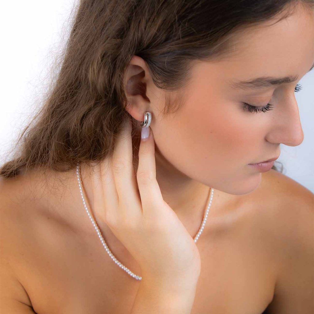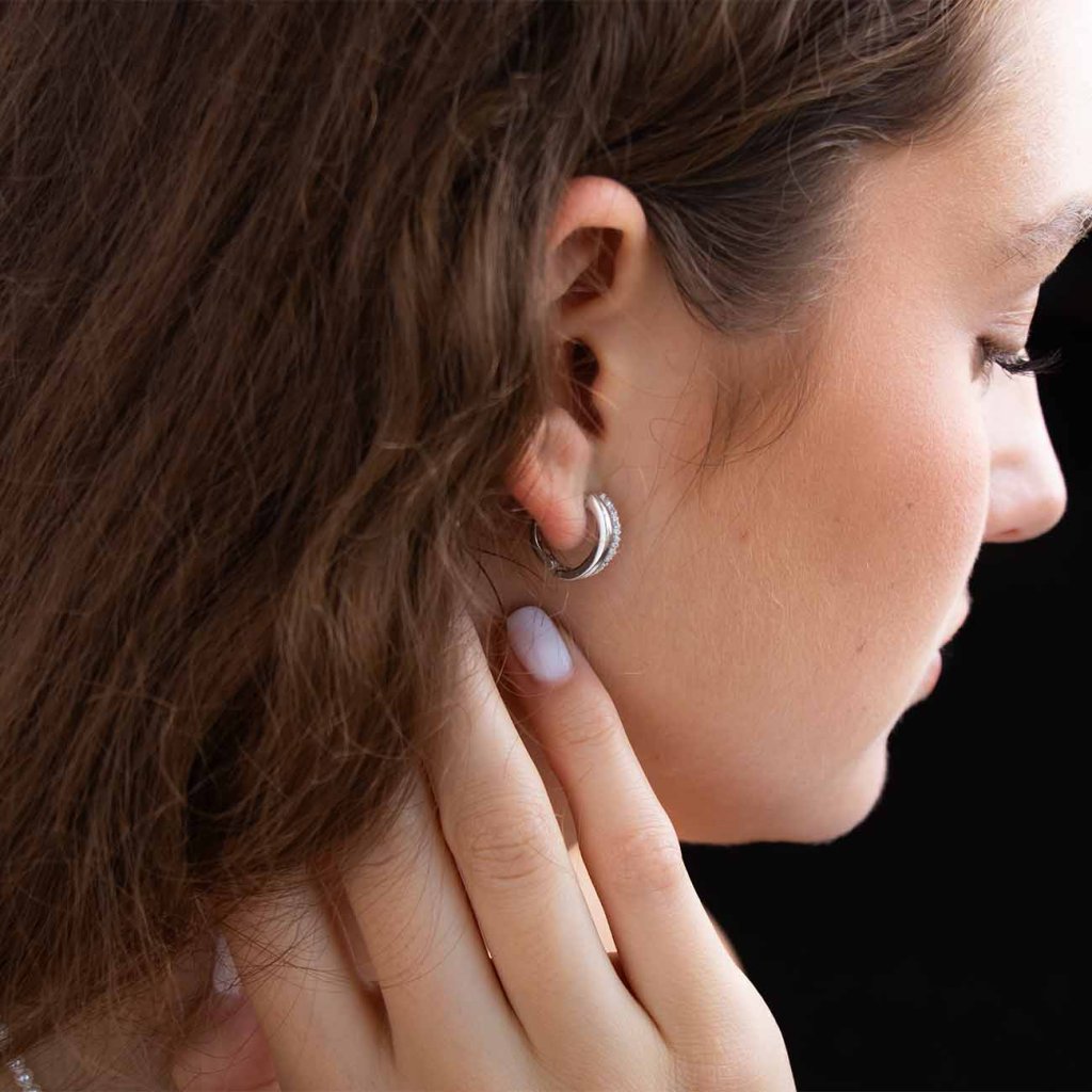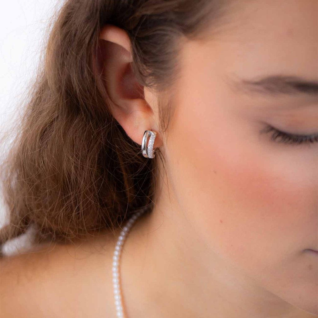 Cerceii circulari eleganți te vor încânta cu designul lor modern și manopera precisă. Două rânduri fine de zirconii clare mărginesc părțile laterale ale centrului neted și lucios, creând o combinație armonioasă de strălucire și minimalism. Datorită închiderii confortabile cu balamale, sunt ideali pentru purtarea de zi cu zi și pentru ocazii festive.
