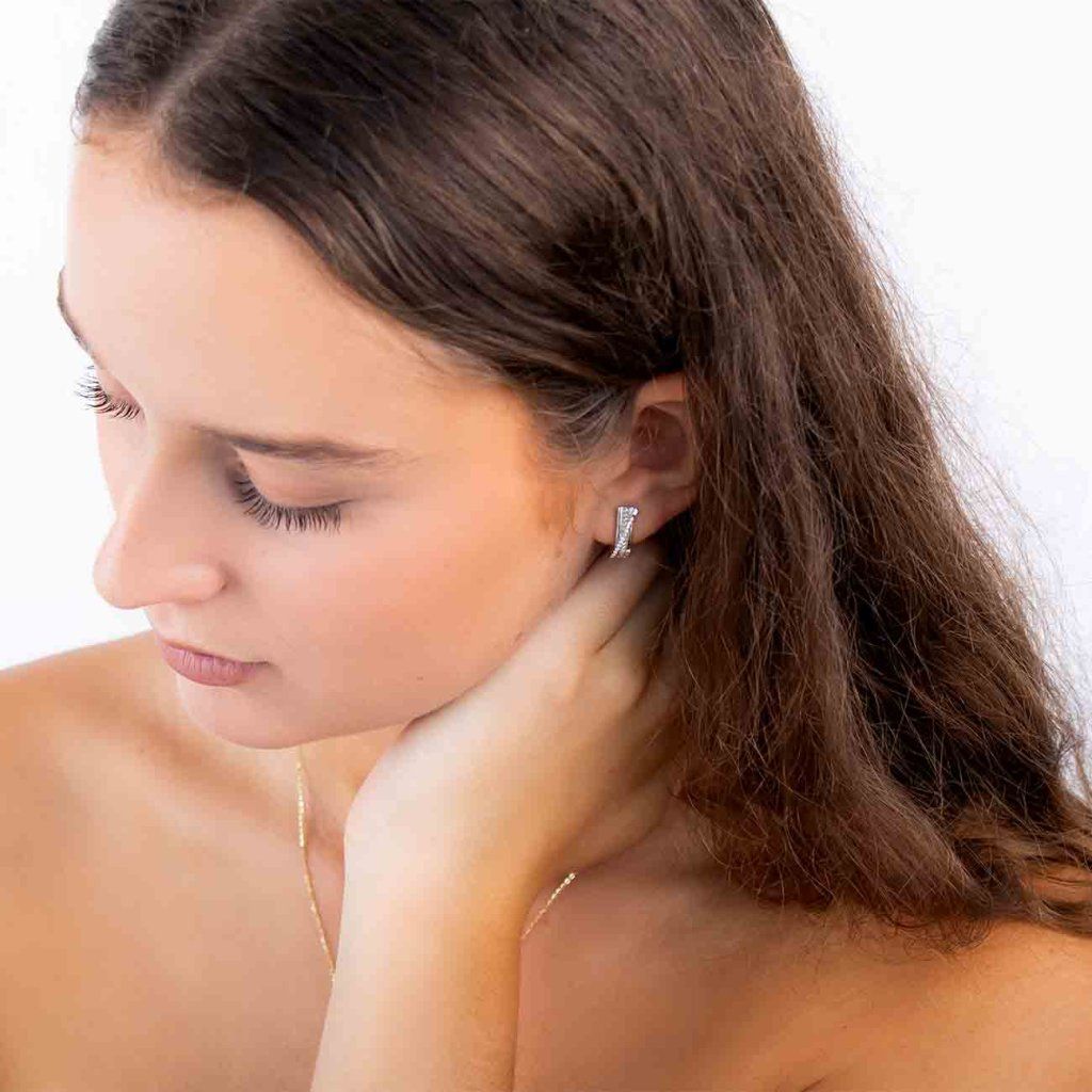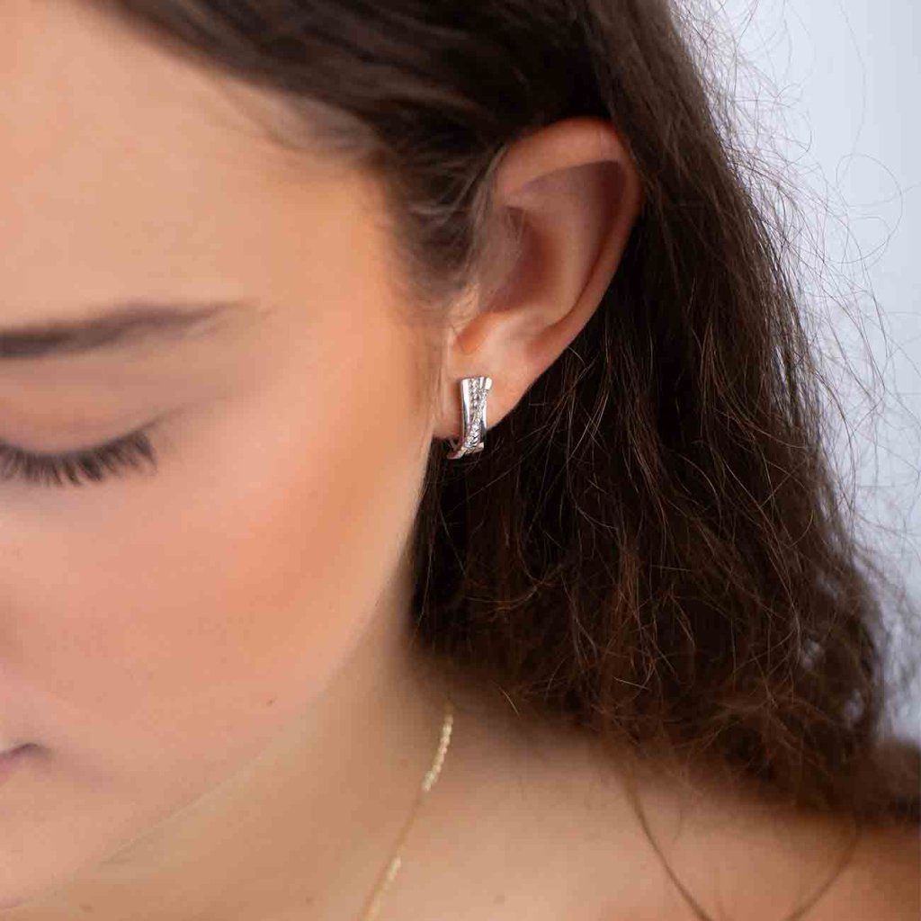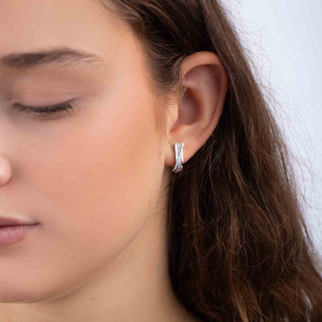 Cerceii eleganți argintii în formă de semilună impresionează printr-un motiv delicat împletit, care completează linia zirconiilor strălucitoare și clare. Datorită prelucrării detaliate și a luciului decent, arată luxos și, în același timp, delicat. Un accesoriu excelent pentru purtarea de zi cu zi și festivă.