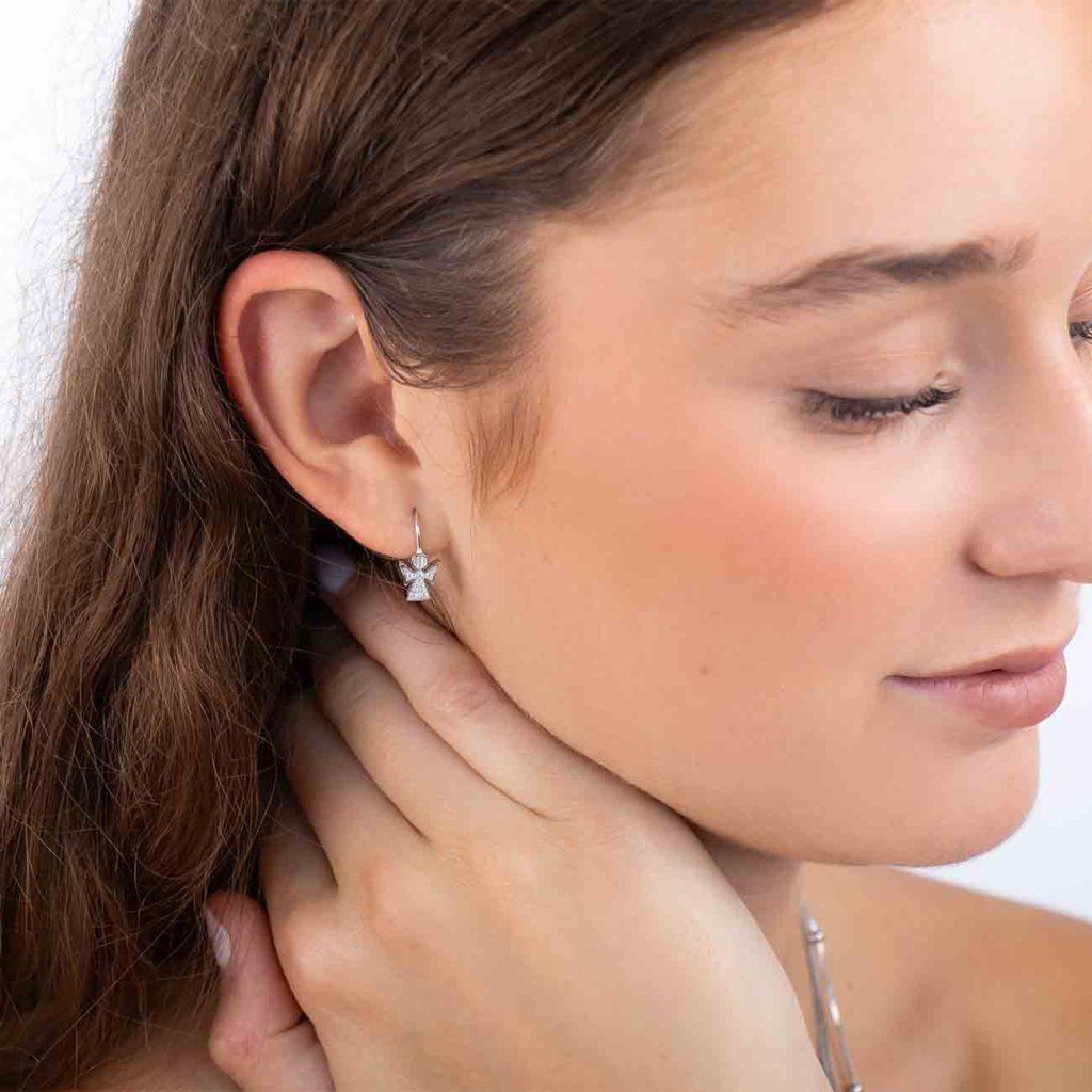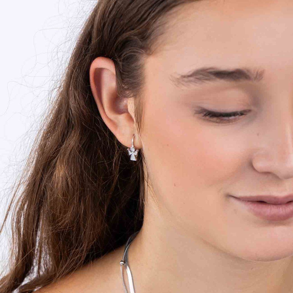 Cercei delicați în formă de înger, împodobiți cu zirconii mici și clare. Un simbol al protecției, al credinței și al luminii într-un design elegant, care va încânta ca un cadou sau un talisman personal.