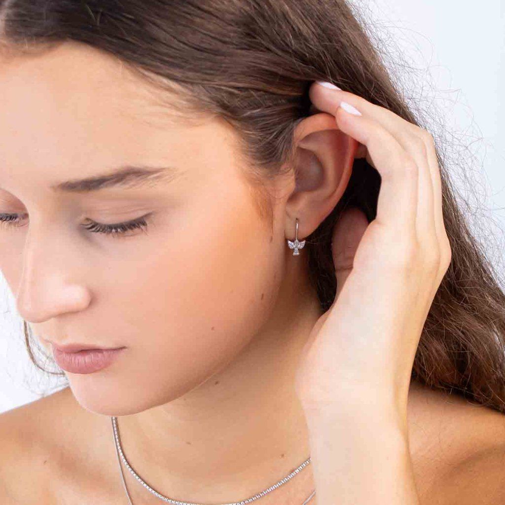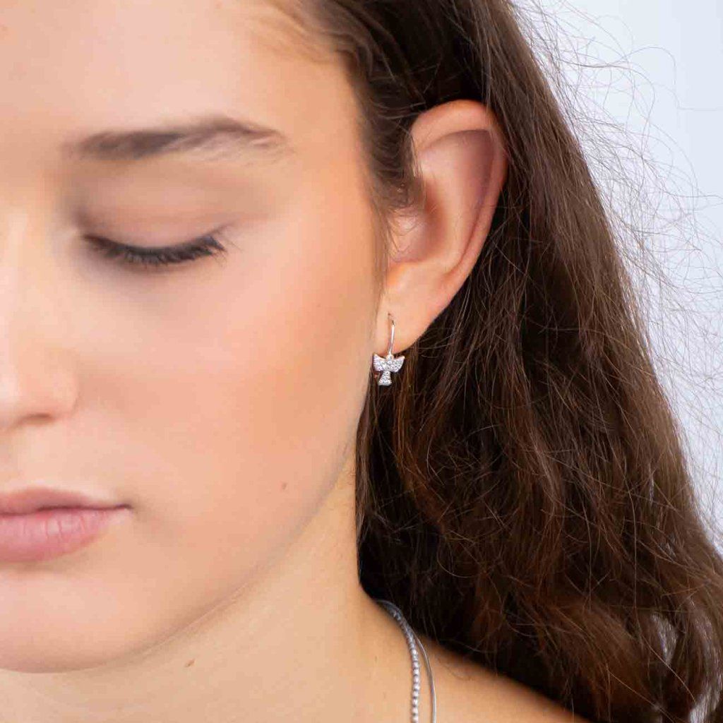 Cercei care îți mângâie sufletul. Acești cercei delicați din argint cu motiv de înger sunt un simbol al protecției, iubirii și speranței. Incrustați cu zirconii strălucitoare clare, radiază o strălucire fină și eleganță. Datorită închiderii patentate, se poartă confortabil și stă fix chiar și pe parcursul întregii zile. Un cadou ideal pentru fete și femei, ca talisman personal.