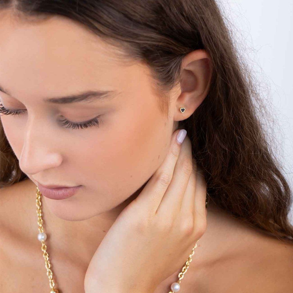 Cercei delicați, dar expresivi, în formă de inimioare din argint placat cu aur Ag 925/1000 cu umplutură neagră pentru un contrast elegant și un aspect modern. Design minimalist care completează frumos atât ținuta de zi cu zi, cât și look-ul de seară.