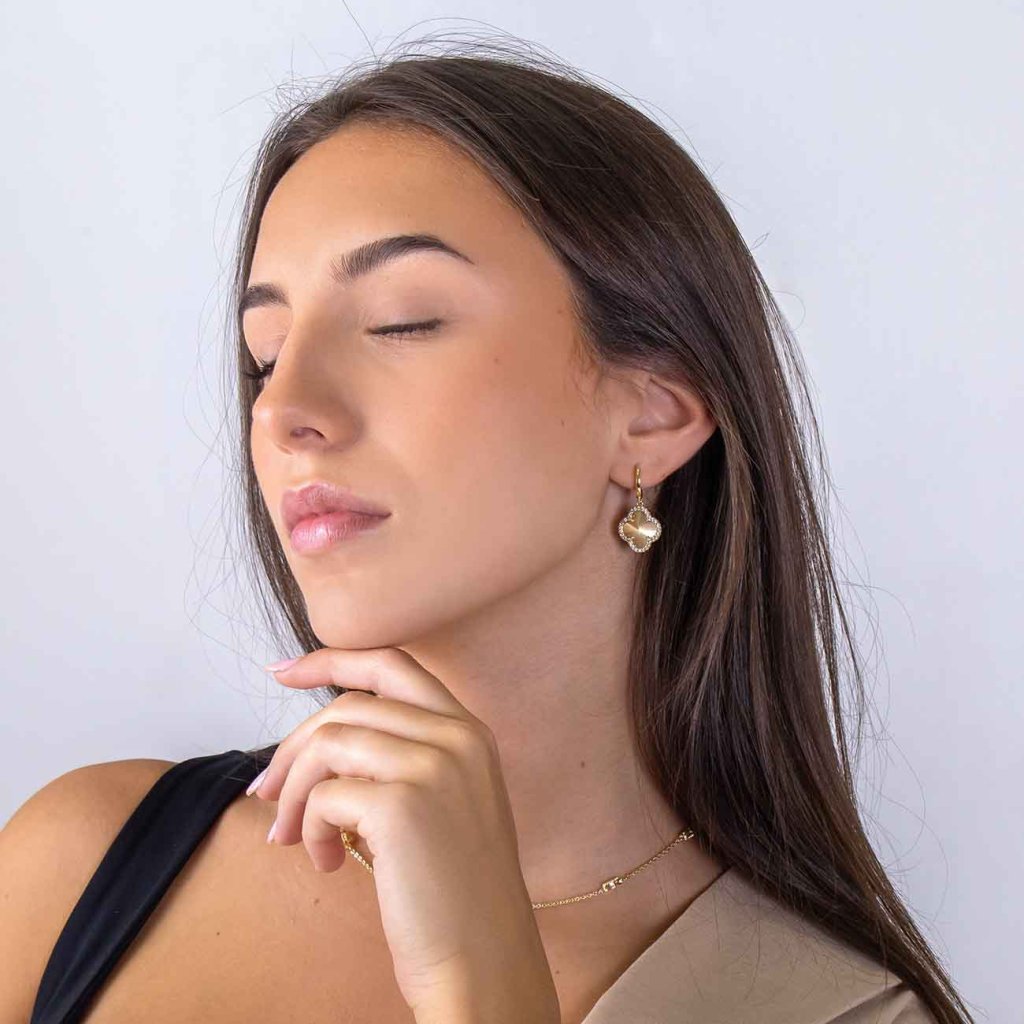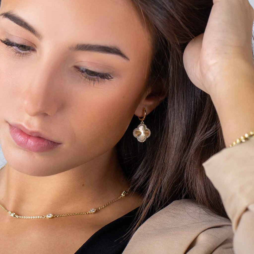 Un trifoi cu patru foi care aduce noroc și stil. Cerceii lungi în formă de trifoi cu patru foi se remarcă prin gravura fină și bordura din zirconii mici și clare, care adaugă o strălucire delicată întregii bijuterii. Datorită închiderii practice cu clapă, stau bine și sunt confortabili la purtare. Accesoriul perfect pentru ocazii festive și o evidențiere subtilă a ținutei de zi cu zi.