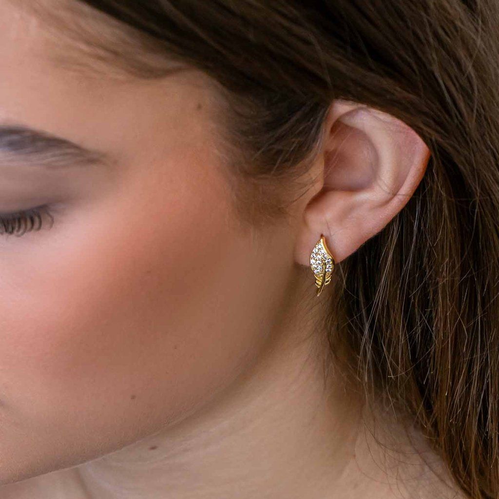 Cercei placați cu aur de 14k cu motiv de frunze, incrustați cu zirconii mici.