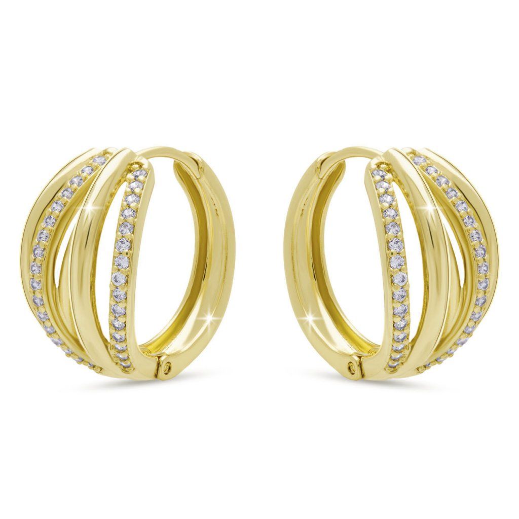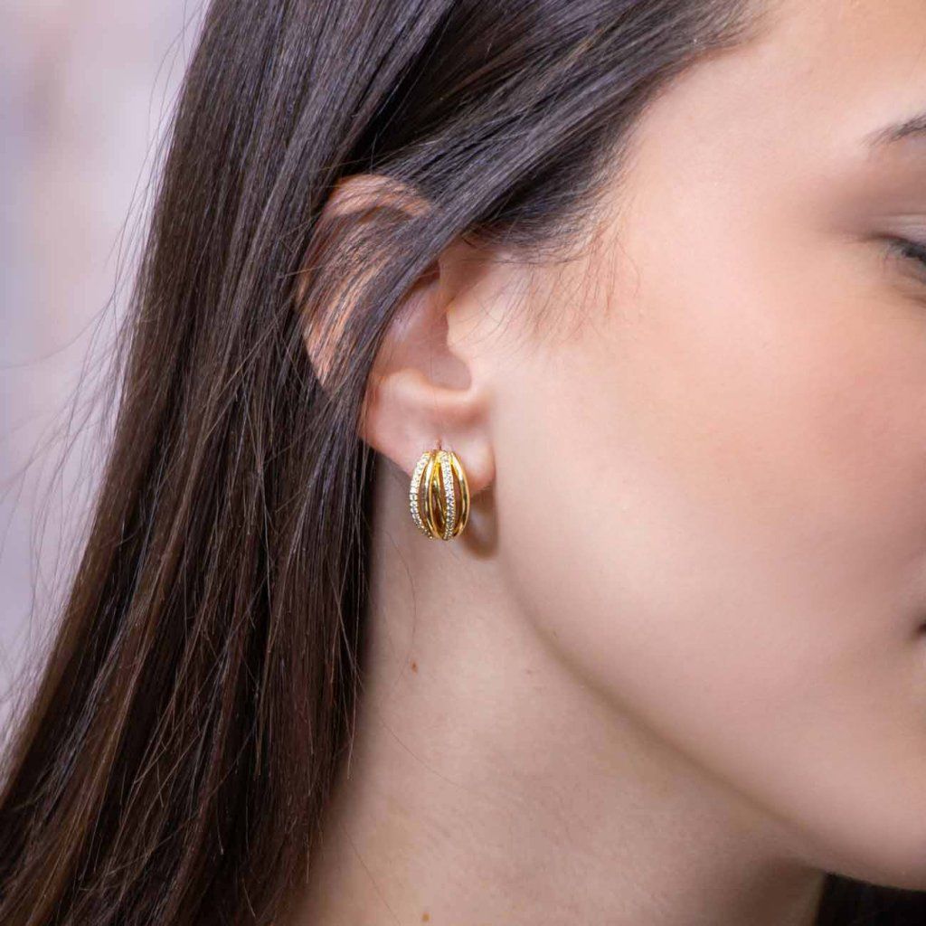 Cercei moderni și îndrăzneți cu un efect de arc triplu care îmbrățișează elegant lobul urechii. Linia centrală de zirconii strălucește în contrast cu suprafața netedă, aurie. Un design atemporal care vă va sublinia individualitatea și stilul.