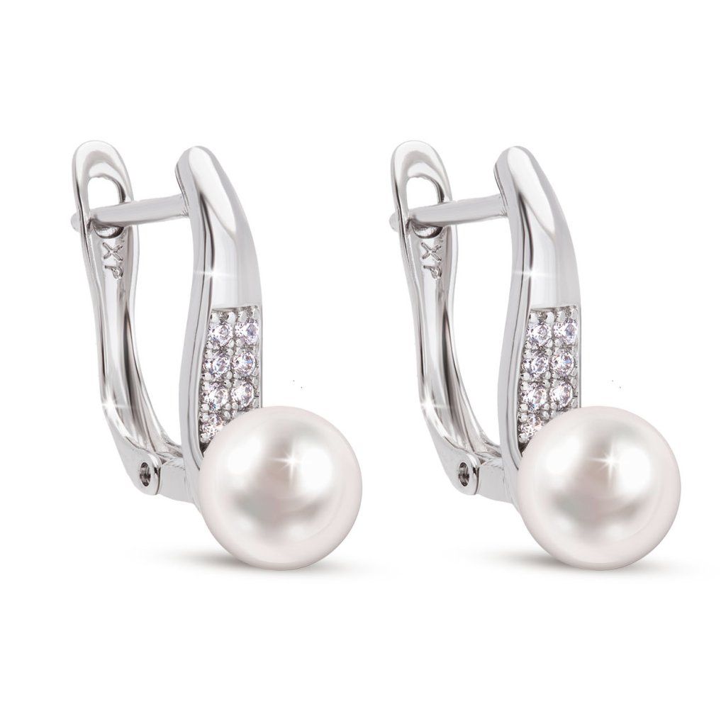 Cercei placați cu rodiu, cu zirconiu cubic și perlă, se remarcă prin eleganța lor simplă. Sau, după cum se spune, frumusețea constă în simplitate. Finisaj cu rodiu protejează cerceii de înnegrirea corozivă și le sporește strălucirea. Au o închidere cu patent rusesc. Acest produs nu conține metale grele.