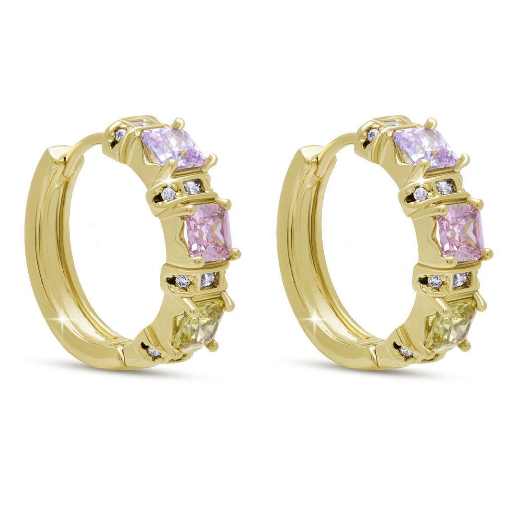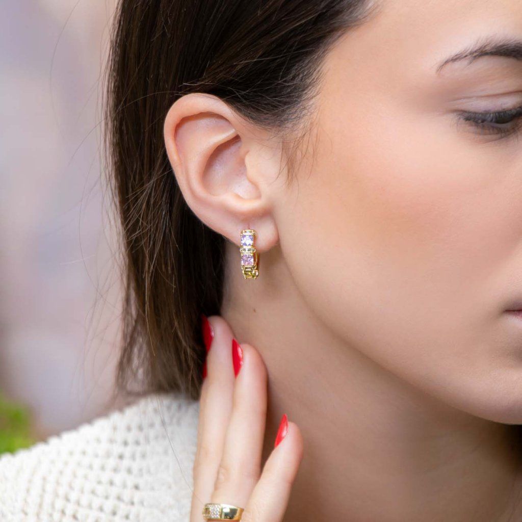 Cercei stilați cu o notă subtilă de jucăușenie – acești cercei placati cu aur sunt decorați cu o serie de zirconii pătrate în nuanțe pastelate de roz, violet și galben, completate de mici pietricele transparente. Forma elegantă de cerc și finisajul lucios le conferă un aspect sofisticat, în timp ce zirconiile colorate aduc lejeritate și prospețime.